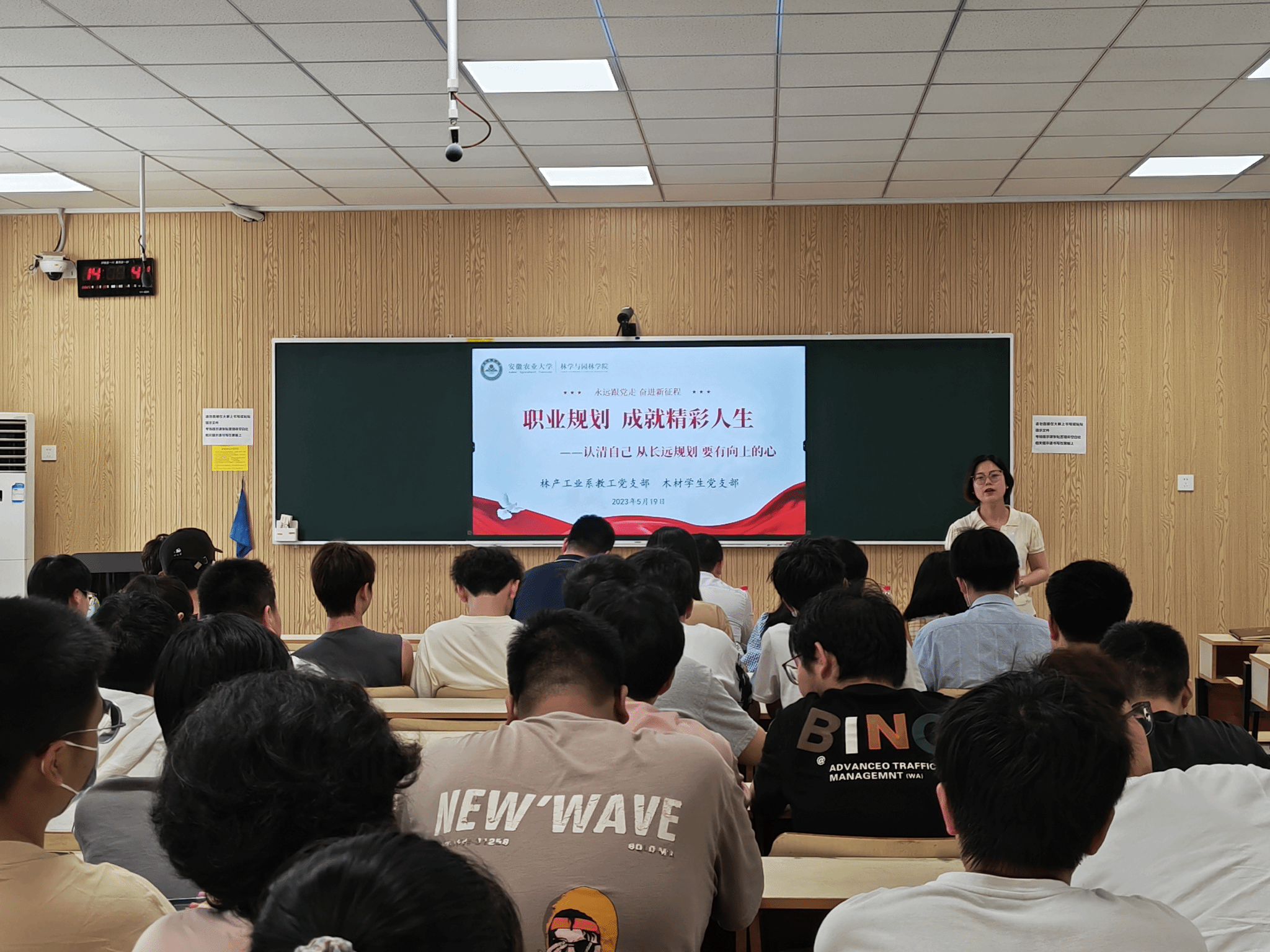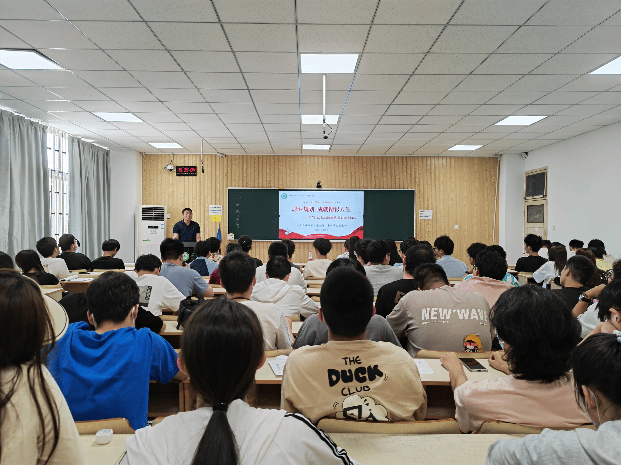 活动旨在为木材科学与工程专业同学巩固专业思想,明晰行业发展方向,指导就业规划。活动由林产工业系教工党支部宣传委员张双燕主持,林产工业系副主任王福利、木材专业辅导员吴倩云以及2020级、2021级和2022级木材专业100余名同学参加。(张双燕 舒欣 一审:胡先业 二审:夏利明 三审:江正君)