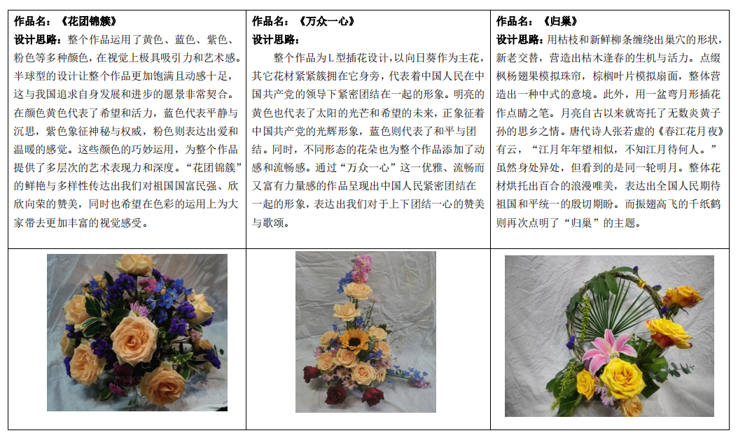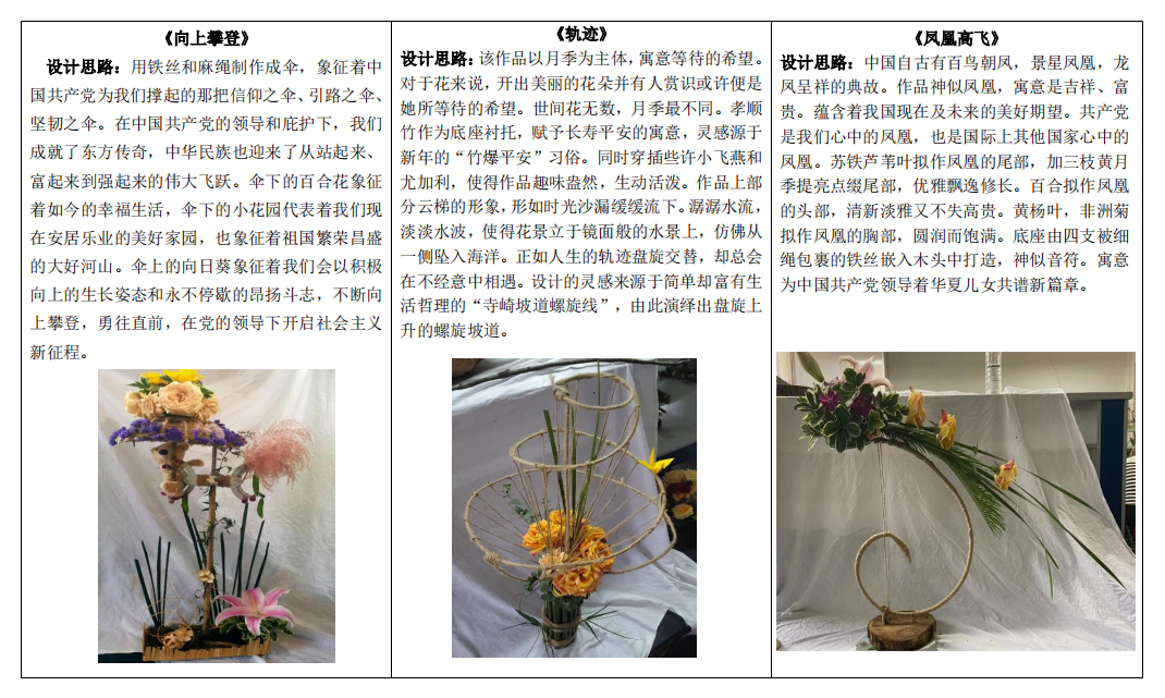 为了让课程学习更聚焦、更有针对性,风景园林系教工党支部着力推动创新课程传播、沉浸式体验。在《园林插花艺术》课程实践中,通过与课程相关的习近平新时代中国特色社会主义思想核心要义的重点阐述、视频展播等方式,引导员工从理论、认知、政治、文化等多维层面,进一步强化思考和认知。课程设计“美好中国”“绿水青山”“传承优秀文化、树立文化自信”“践行社会主义核心价值观”“责任担当”“工匠精神”等11个主题,将专业思想、主题教育有机融入课程,加深员工对中华传统文化的认识、对中华优秀文化的理解、对实现中华民族伟大复兴中国梦的信心。