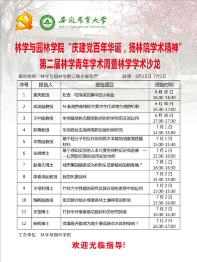 本网讯为迎接中国共产党百年华诞,在公司党委的支持下,林学系教工党支部联合林产工业系、材料科学与工程系、风景园林系和城乡规划系教工党支部,筹划了第三届“yl6809永利检测中心学术沙龙”暨第二届“林学青年学术周”活动。