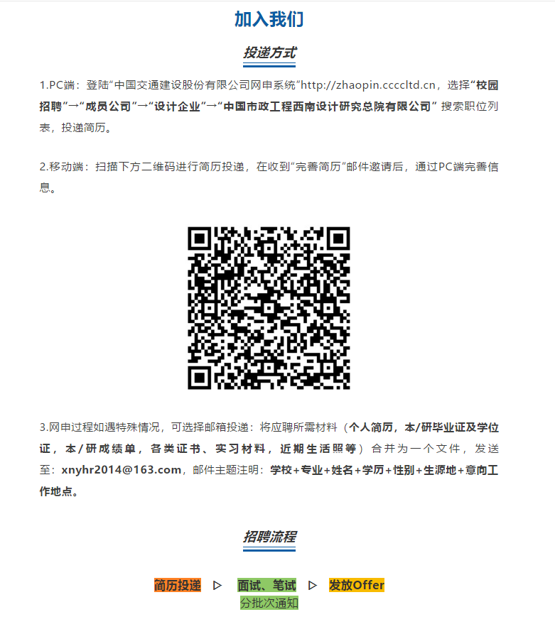 中国市政工程西南设计研究总院有限公司成立于1956年,是原国家住房和城乡建设部直属的市政、建筑、风景园林、公路与城市防洪甲级勘察科研设计咨询单位,现为国务院国资委管理的中国交通建设集团有限公司全资子公司。公司总部位于四川省成都市,现有员工1200余人,拥有各类专业技术人员1100余人,其中教授、高级工程师400余人,中初级技术人员700余人。享受政府特殊津贴,国家、部、省级突出贡献专家21人,四川省学术与技术带头人2人,四川省勘察设计大师7人,各专业注册工程师(建筑、结构、公用设备、电气、道桥、规划、暖通、岩土、咨询、监理)200余人。专业配备合理,技术力量雄厚,设备保障精良,实践经验丰富,管理体系完善,社会信誉良好。