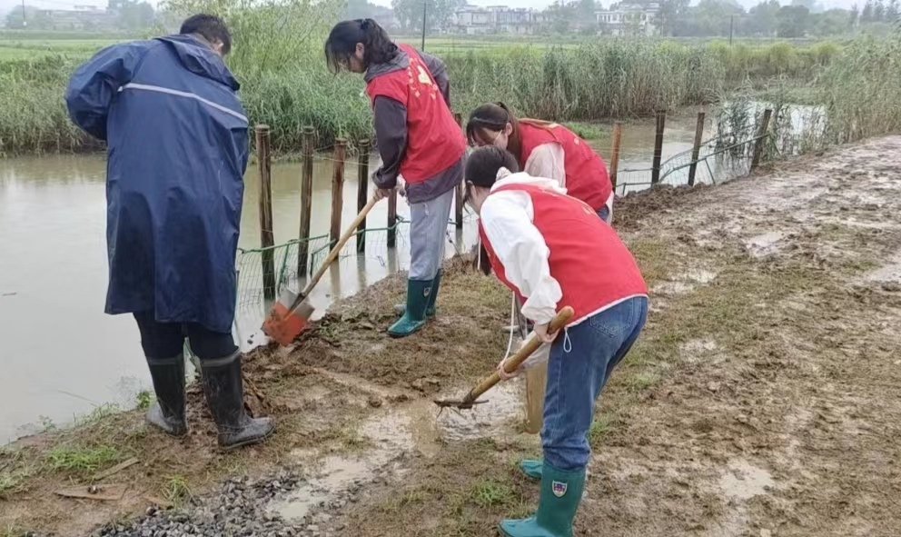 团队成员李洋、胡顺康脸上挂满豆大的汗珠,在当地退休干部带领下在大堤坡面仔细检查。“发现可能出现危险的地方就要及时补救,要保证防汛工作的全面性”,他们谨记防汛工作要点,整个上午都不敢放松一点警惕,确保大堤防汛正常进行后,李洋认真地说:“能为家乡防汛工作出一份力,我们感到特别自豪。”