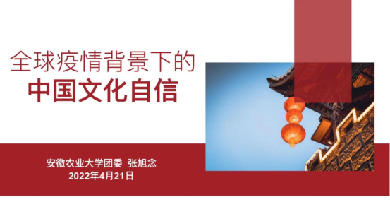 中国在抗击新冠肺炎疫情中彰显了中国特色社会主义制度的巨大优势,中国人民在团结抗疫中进一步坚定了文化自信。在这样的背景之下,校团委张旭念老师在会议上围绕着“全球疫情背景下的中国文化自信”这一主题,从在抗击疫情中坚定中国文化自信、近代以来中国文化自信的历史和理论逻辑、中国文化的内生优势和深厚底蕴、中国文化自信的底气这四个方面为大家进行了深入解读,为大家阐述了在疫情之下中国的独特的文化自信。我国抗击新冠肺炎疫情斗争取得重大战略成果,充分体现了中国文化的独特优势,也大大提升了中国人民的文化自信,现如今,防控新冠肺炎疫情“阻击战”取得阶段性成效,但当前疫情形势依然严峻,防控仍处关键阶段,我们每一个人都不能置身事外。通过本次线上团课的学习,大家了解了疫情防控背景之下的中国文化自信,增强了疫情防控的信心,为之后团干队伍工作开展打下了良好的基础。