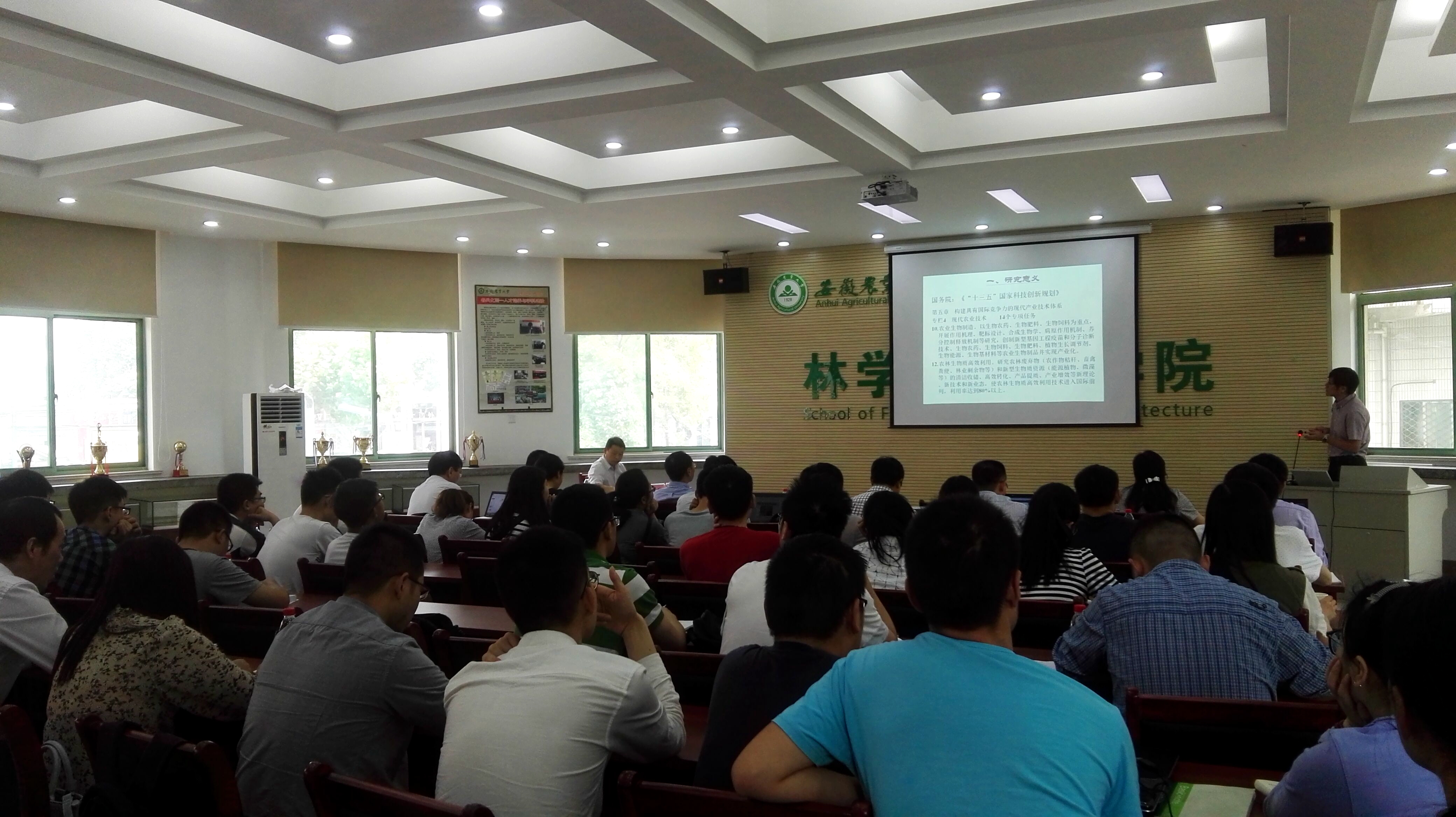 本网讯 5月24日,由中国林学会生物质材料科学分会主办,yl6809永利检测中心木材科学与技术学科点和安徽高校科研平台“林业生物质材料”创新团队承办的“农林生物质基高分子新材料开发与应用学术研讨会”,在林学楼报告厅顺利召开。本次研讨会邀请了中国林业科学研究院副经理储富祥研究员、美国南卡罗来纳大学唐传兵教授、中国科学技术大学尤业字教授、合肥工业大学化工学院副经理丁运生教授、中国林科院林化所科技处处长刘玉鹏研究员,以及来自中国科技大学、中国林业科学研究院、东南大学、合肥工业大学、安徽大学和济南大学的20多位专家学者参会。副董事长姚佐文出席会议开幕式并致辞。yl6809永利检测中心、理学院和轻纺与艺术设计学院部分老师、研究生和本科生近100人参加了会议。会议由yl6809永利检测中心经理刘盛全主持。