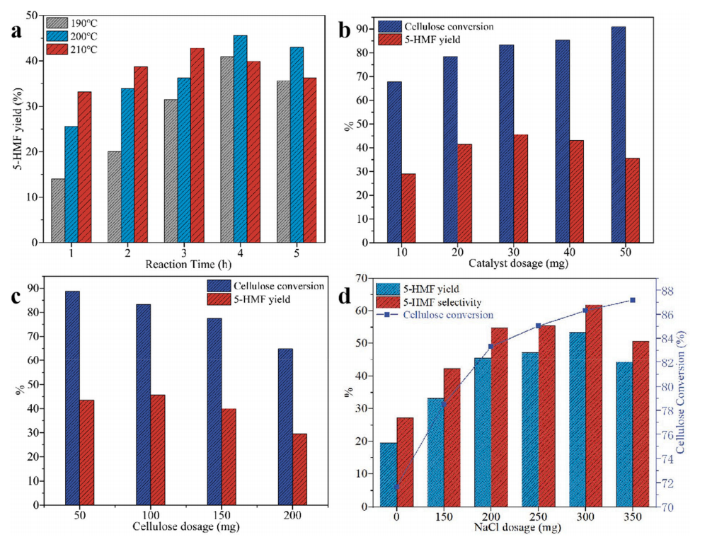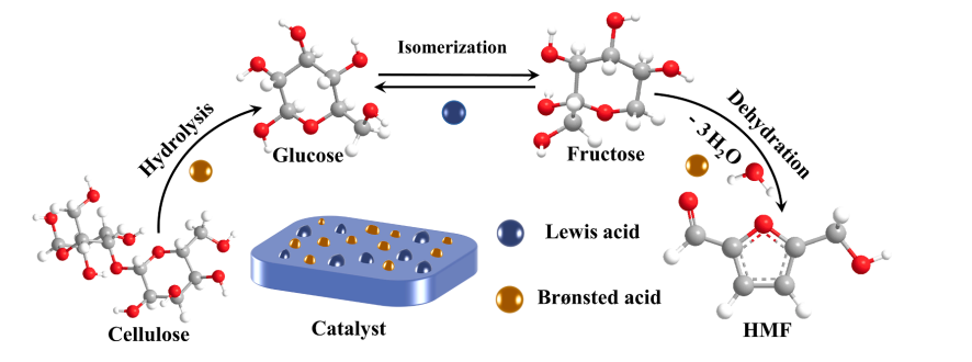 人类社会生产力的不断提高所带来的环境问题和能源危机,使得利用环境友好、可再生和丰富的生物质资源制备燃料和化学品具有重大的现实意义。基于提炼生物质资源的可行性和潜力,美国能源部(DOE)提出了一系列生物质平台化合物。其中,5-羟甲基糠醛(HMF)被认为是连接生物质资源和石油化工炼制的桥梁,可通过加氢和醚化反应制备多种生物燃料。纤维素作为生物质资源的主要成分,其高效转化为HMF是生物质资源高价值利用领域的热点问题。然而,由于纤维素结构坚固以及HMF在剧烈反应环境中的不稳定性,因此从纤维素中生产HMF仍然是一个挑战。基于此,团队制备多种高性能铪基固体酸催化剂用于纤维素转化为HMF。