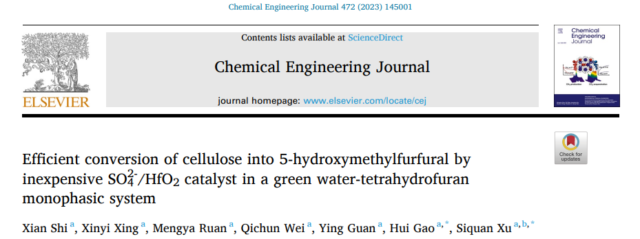 论文1:《绿色单相体系中磺酸改性氧化铪物种高效催化纤维素转化制备5-羟甲基糠醛》(Efficient conversion of cellulose into 5-hydroxymethylfurfural by inexpensive SO42-/HfO2 catalyst in a green water-tetrahydrofuran monophasic system)。yl6809永利检测中心硕士研究生施羡为论文的第一作者,高慧教授和青年教师徐思泉为论文的共同通讯作者。该研究以磺酸基团嫁接改性的过渡金属氧化物物种(HfO2)为催化剂,结合无催化助剂的水与四氢呋喃溶剂,成功以纤维素为原料获得了高HMF产率。通过结构与性能研究发现其化学组成和反应条件显著影响该催化剂的酸性性能与催化活性并提出了该催化剂参与转化过程中的机理。另外该研究发现此催化剂在助剂与无助剂体系中均能获得优异的产率,符合当今绿色环保的理念,具有巨大的发展潜力。