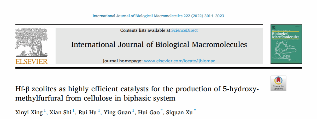 论文2:《Hf-β分子筛作为双相体系中纤维素生产5-羟甲基糠醛的高效催化剂》(Hf-β zeolites as highly efficient catalysts for the production of 5-hydroxymethylfurfural from cellulose in biphasic system)。yl6809永利检测中心博士研究生邢馨忆为论文的第一作者,高慧教授和青年教师徐思泉为论文的共同通讯作者。该研究基于β分子筛成功地制备了一系列具有不同Hf元素含量的双功能酸催化剂(Hf-β)。适宜Hf元素的存在使得该催化剂具有优异的孔隙结构与均衡的Bronsted&Lewis酸度,促进了脱水和异构化步骤的持续进行。在以纤维素等不同碳水化合物作为底物转化时,该催化剂均能展现出良好的催化活性。此项研究工作为更复杂的生物质原料高值化利用提供了参考价值。