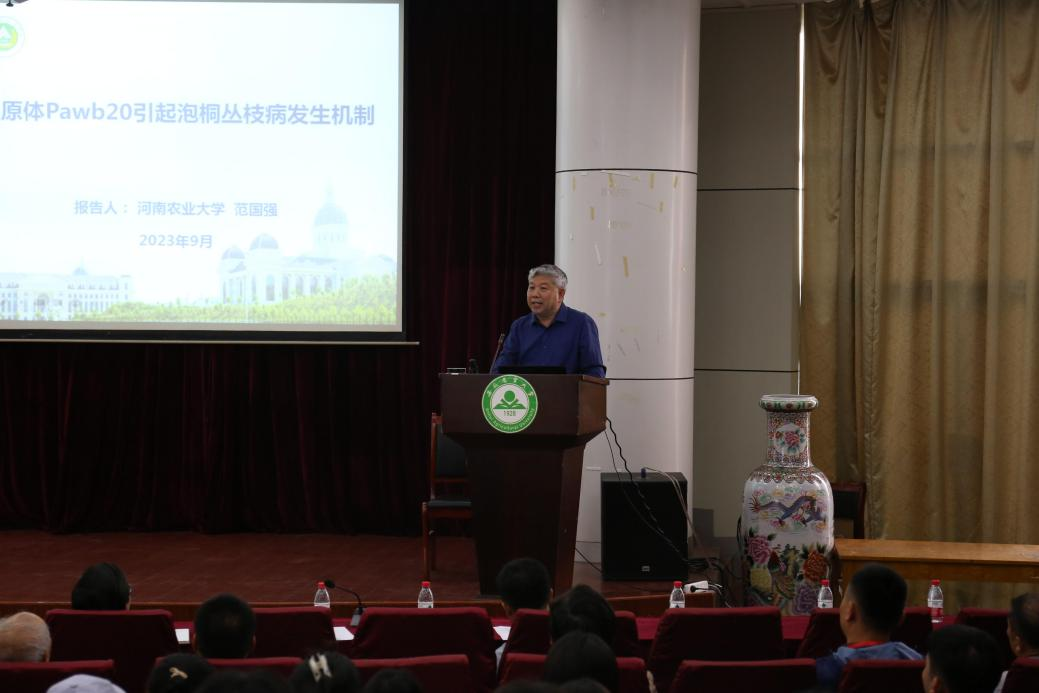 范国强教授阐述了泡桐丛枝病的发生机制,详细介绍了丛枝植原体效应子Pawb20及相关蛋白如何互作并导致丛枝病发生,与会师生针对泡桐丛枝病进行了讨论交流。范国强教授不仅带来了一场精彩的学术报告,同时也勉励研究生同学静下心来、全盘思考、合理设计。