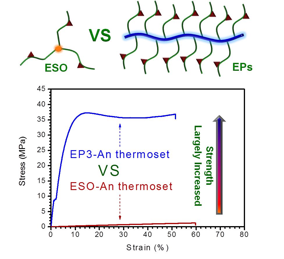 图1.环氧大豆油VS环氧高分子结构模型及其机械性能对比
