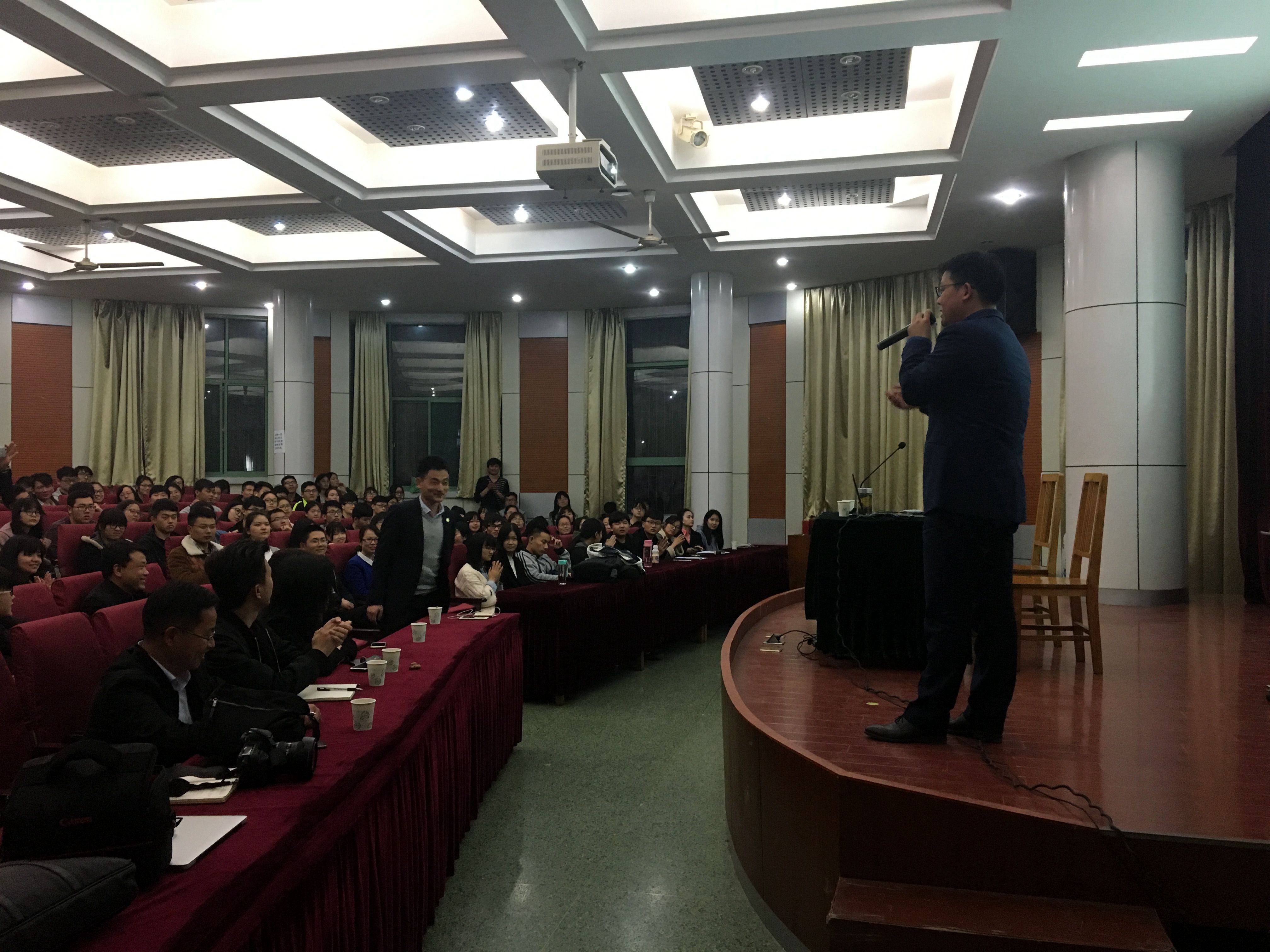 张友德以平易近人的态度、幽默风趣的方式介绍了其公司的发展状况与发展方向,通过列举公司发展期间经历的困难和坎坷,勉励同学们面临挑战,如果敢于“逼一逼”自己,在机会面前就会多一分把握。张友德又以“接地气”的话语跟大家分享了自己的艰苦求学道路与创业历程,鼓励同学们在校期间做好职业规划和人生规划,尽可能的挖掘自身的潜力,锻炼可迁移能力,提高自身综合素质,为创业或者就业做好能力储备。本期“郁林讲坛”持续两个多小时,期间,张友德与同学们积极互动,分享学习工作心得,交流专业行业发展理念、发展前景,用幽默的语言和睿智的反应赢得同学们的掌声。