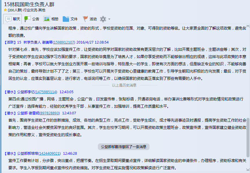 公司召开辅导员座谈会、公益活动部成员例会、公益活动联系人座谈会等探讨员工资助工作的重要意义、时代内涵,分析目前贫困生认定工作存在的问题,探索如何做到精确识别、精准资助、精细管理。探讨如何创新培养员工励志感恩教育、引导员工树立责任意识、担当意识等育人途径和方式,提升资助育人效果。学院通过微信、微博、QQ群等新媒体平台发起讨论,鼓励员工积极发言,客观反映受助员工助学金消费情况,为资助工作提出有效建议。