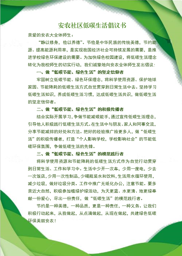 安农社区低碳生活倡议书