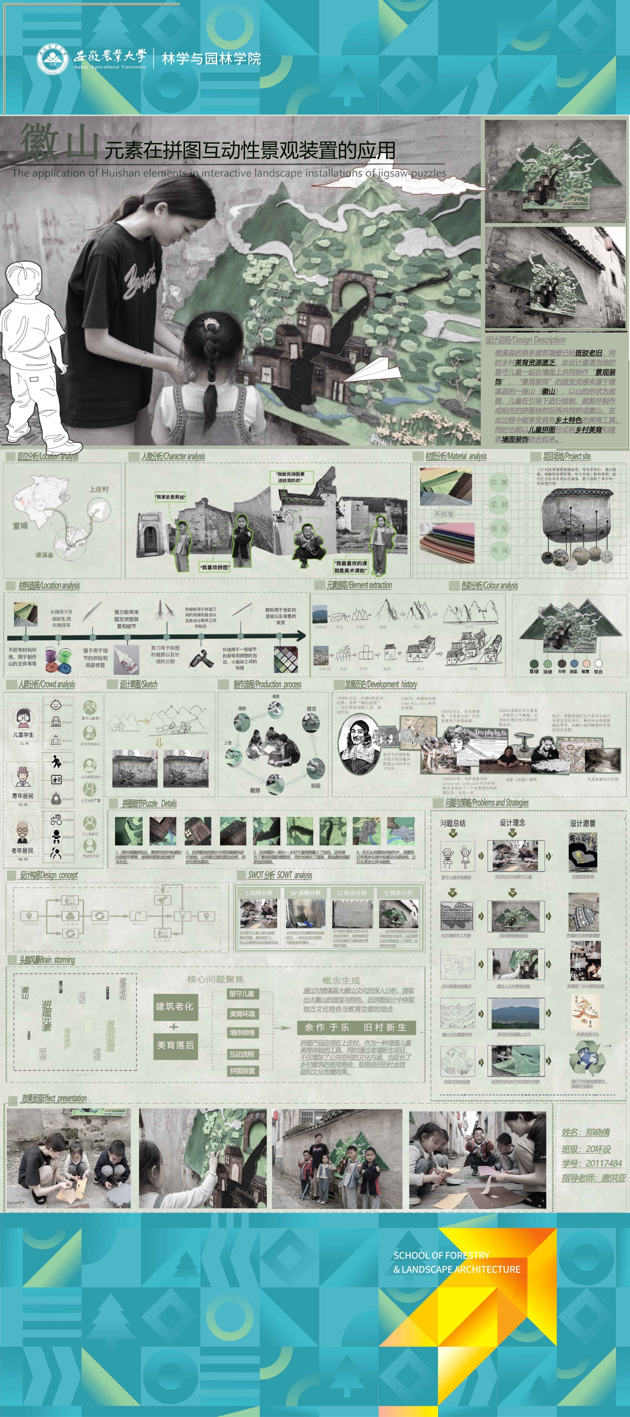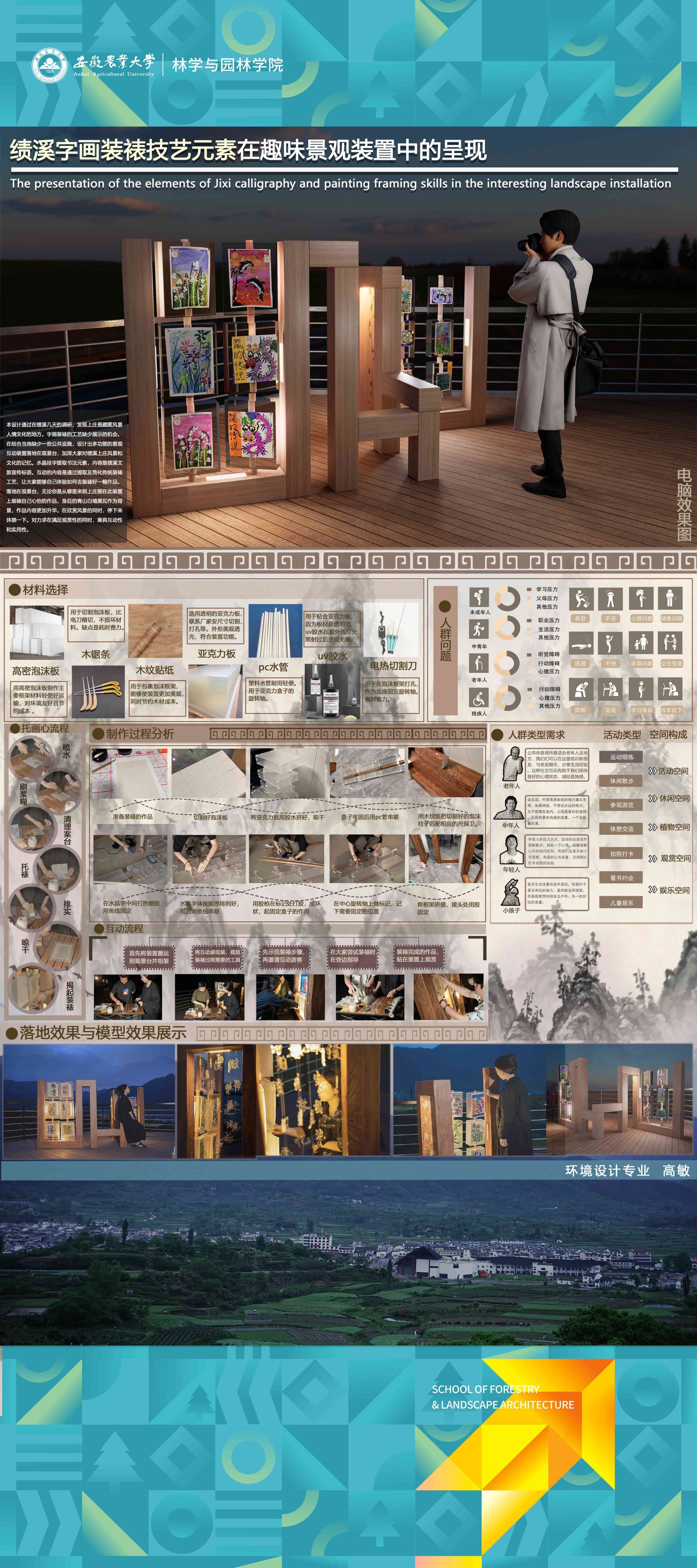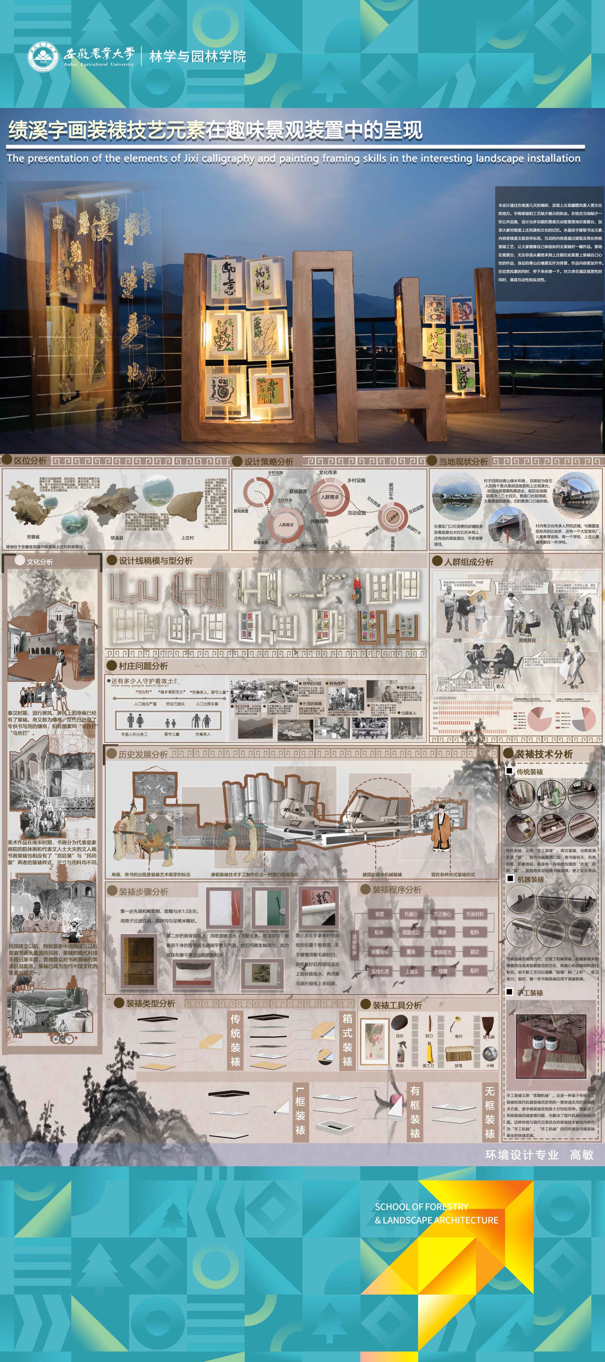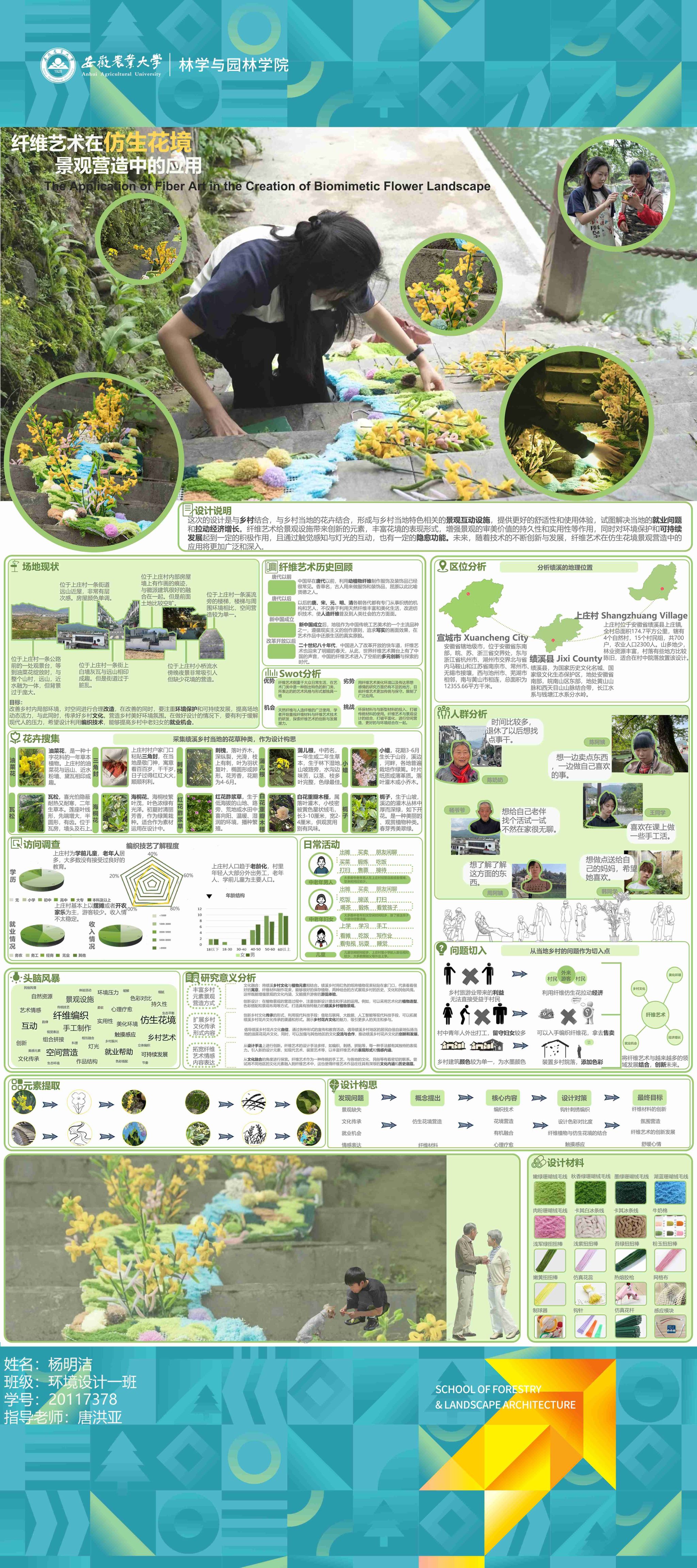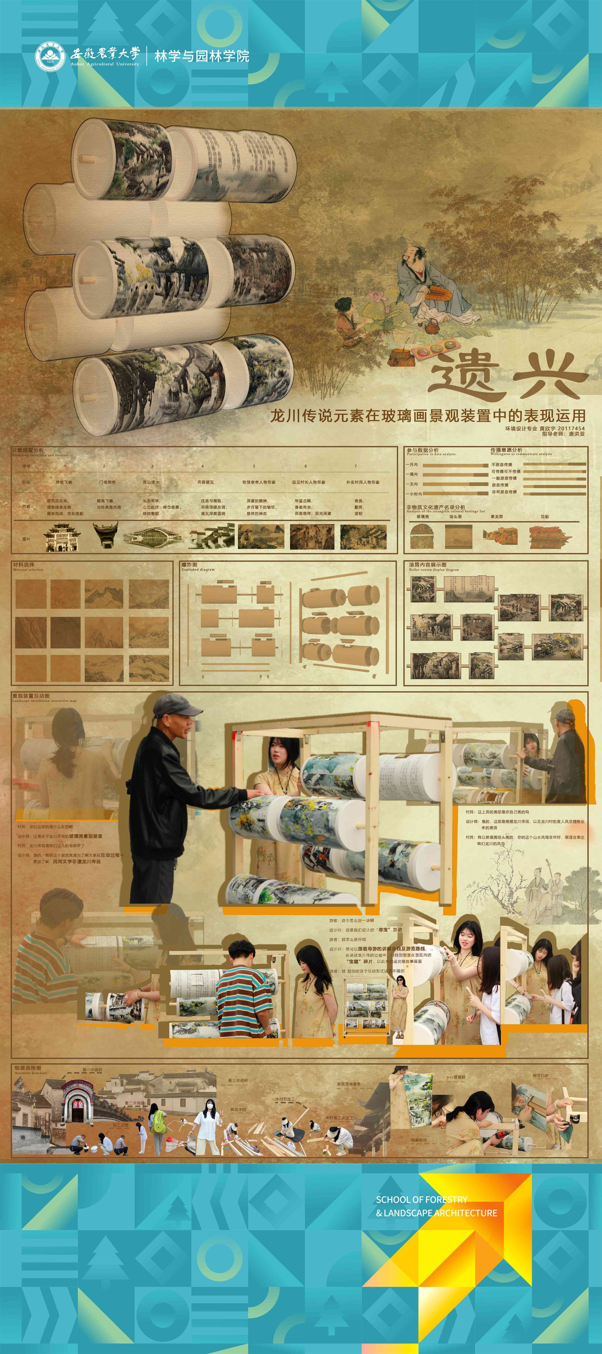 2024届环境设计专业围绕“服务乡村、创新设计”的理念,形成地方政府出题、教师项目认领、员工真题真做的毕业设计改革思路,聚焦和美乡村建设,城镇更新、非遗活化等在地性选题,开展真实项目毕业设计工作。员工在指导教师的带领下将毕业设计与乡村设计、村民共建、非遗传承高度融合,实现“真题真做”,扎实做好设计赋能乡村振兴,切实将设计落在田野上,把论文写在乡村里,真正做到“农大设计”。