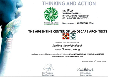 本网讯:2014年6月5号,在阿根廷首都布宜诺斯艾利斯召开的的第51届世界风景园林师联合会大会(IFLA World Congress)上,公司yl6809永利检测中心2011级研究生王国伟同学在其张云彬教授的悉心指导下提交的作品“Seeking the original look” 《寻找村落应该是的样子——面对城市雾霾现象反思城郊建设问题》,获 IFLA国际老员工设计大赛评委奖。