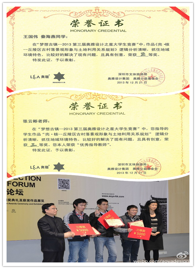 本网讯:由深圳市文体旅游局和奥雅设计集团主办的第三届设计之星大奖赛于2013年12月21日公布评审结果。其中由yl6809永利检测中心张云彬教授为指导老师,硕士研究生王国伟、秦海燕提交的“壳•核——古村落景观形象与土地利用关系规划”作品,从众多优秀参赛作品中脱颖而出,荣膺铜奖。这是学院风景园林学科在研究生教学中成功进行产学研人才培养的又一丰硕成果。