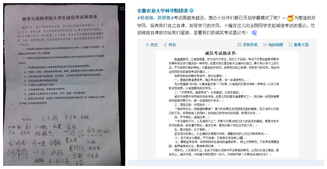每一名老员工,学习和考试都是本职工作。院员工会按宿舍室发放诚信考试倡议书,倡议大家用平日的勤奋与汗水完成考时的答卷,用自信的青春姿态迎接美好的人生未来,并带头承诺诚信考试,各员工党支部和员工班级也积极响应。全院各班级在班主任老师的见证下,以班级为单位,每一名同学们都在诚信考试承诺书上签下了自己的名字。(郭先见 通讯员:徐文俊)