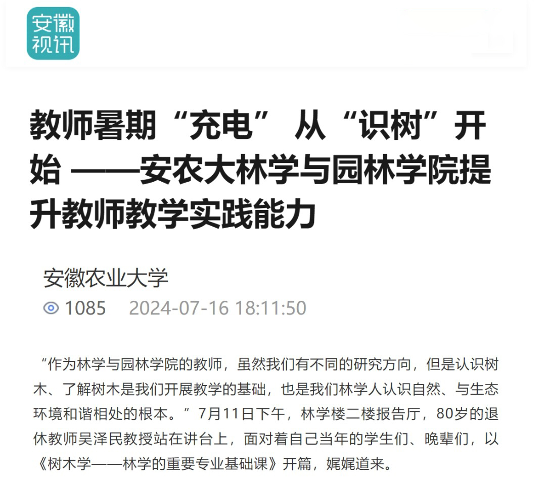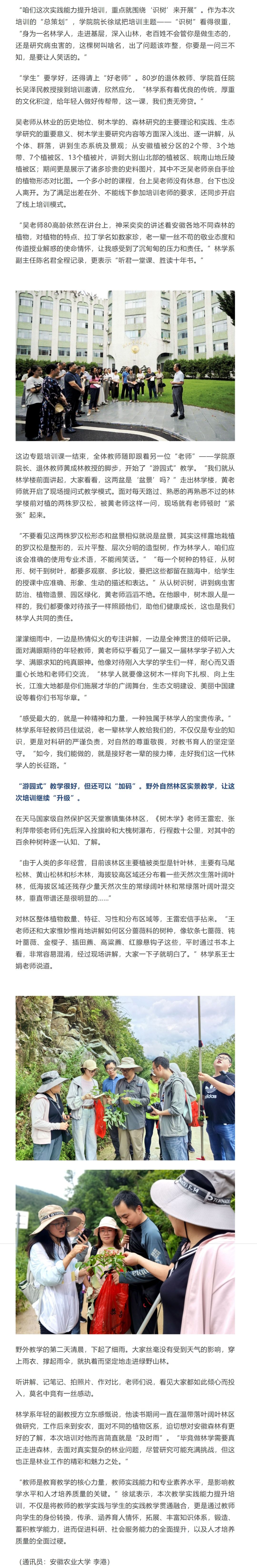 7月11-14日,yl6809永利检测中心启动教师教学实践能力提升计划,特邀学院首任经理、退休教授吴泽民,学院原经理、退休教师黄成林教授等名师大家,为林学系全体教师及部分相关专业教师开展专题培训、校内实践训练,同时深入天堂寨自然保护区,进行野外实景教学,进一步夯实教师专业水平,提升公司产品质量,并通过教师专业知识、教学能力的全面提升,促进人才培养质量的全面过硬。7月16日,《安徽视讯》对公司此项工作进行了专题报道。
