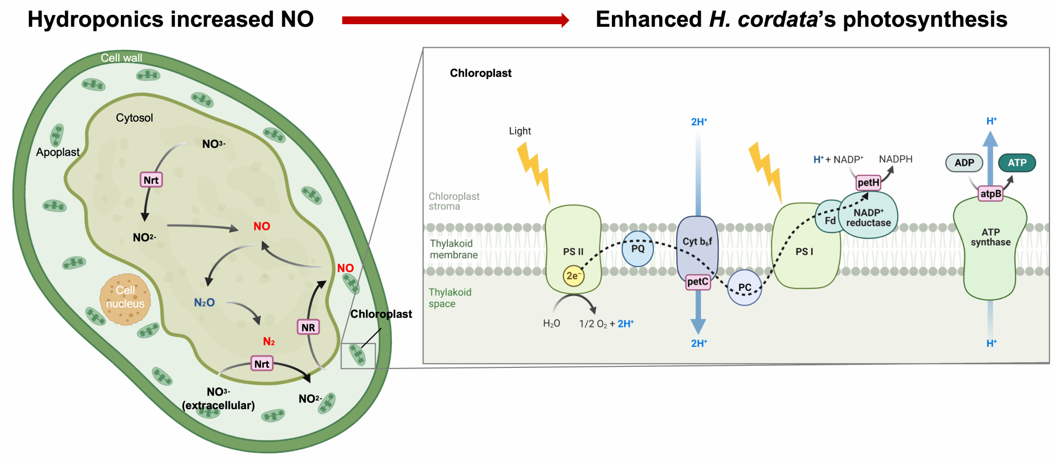 研究结果表明,与传统土壤栽培相比,水培栽培的鱼腥草显示出了更高的生物量和更低的重金属及苯类污染物累积。特别是,水培条件下的鱼腥草在氮代谢和光合作用相关基因的表达上有显著提高,同时,一氧化氮(NO)的含量也显著增加,这些因素共同促进了鱼腥草的生物量积累。