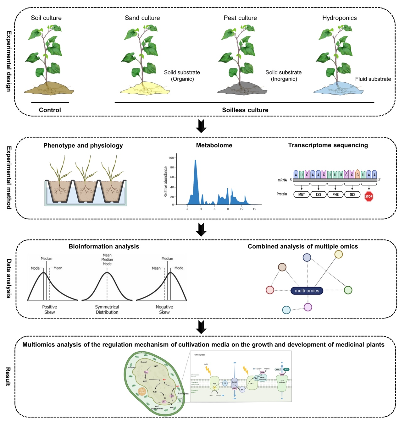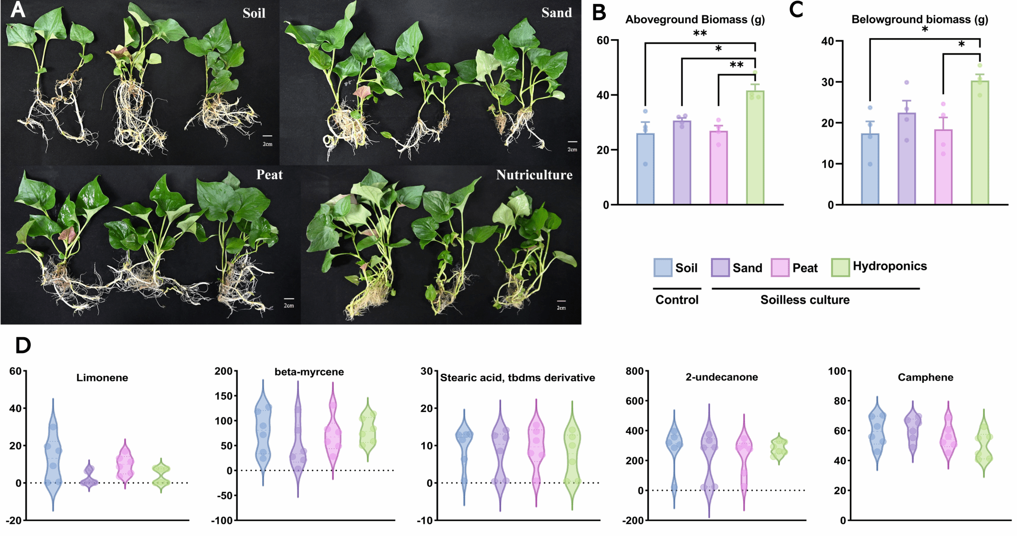 本研究采用了无土栽培的方法,具体为水培和固体基质(沙和泥炭)栽培。通过转录组学(RNA-seq)、代谢组学(Metabolomics)以及常规的生理生化分析,研究团队对比了不同栽培条件下鱼腥草的生长发育、生物量、代谢物质和基因表达的差异。