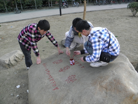 活动由该院2010级城市规划专业的同学发起,志愿者服务队的同学利用周末对校园内所有石碑、石刻上的刻字进行了描红翻新,并对石碑本身及周边进行了清理,使石碑脱去了时间的尘土,重现熠熠神彩。