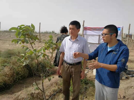 本网讯 8月29日,安徽省科技厅党组书记、厅长宛晓春一行来到新疆和田地区皮山县检查指导公司李义勇博士主持的援疆项目“和田地区核桃生态及丰产栽培技术研究与示范推广”基地。正在基地现场培训的公司博士研究生王兆成(导师为傅松玲教授)汇报了项目基地建设、技术培训等进展工作。