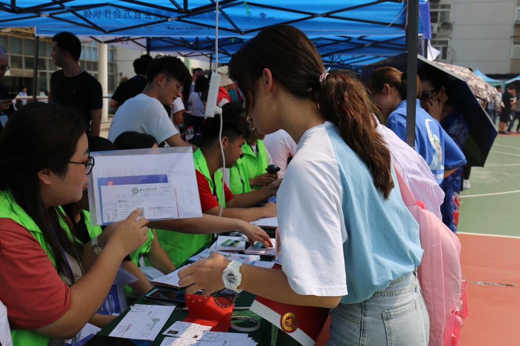 9月7日报到日,学院在第二运动场设立接待台,热情迎接前来报到的学院新生,公司党政领导、系部主任到场指导迎新工作,专职辅导员、新生辅导员全部到场。截止下午5点,学院计划录取360人,已完成报到351人。
