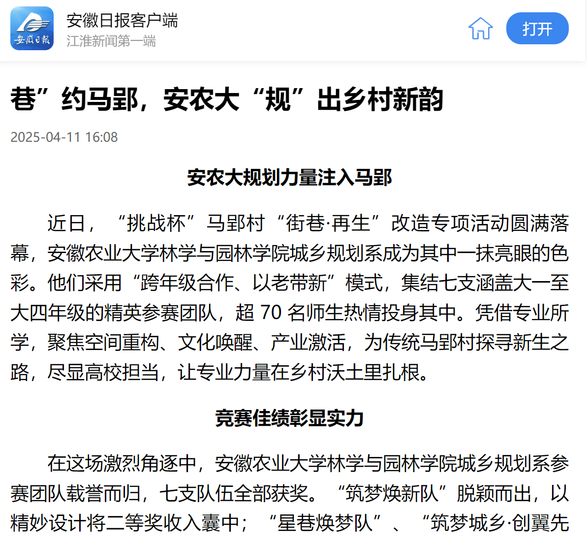 “青年驻村规划师”项目创新性地探索了高校青年参与乡村振兴的有效路径。团队摒弃“蜻蜓点水”式的志愿服务,选择长期驻村陪伴,用专业所长解决乡村实际问题。这种“陪伴式服务”模式不仅使规划真正落地生根,更在服务过程中实现了青年与乡村的共同成长。项目自实施以来,已获得《安徽日报》等多家媒体报道,引起社会广泛关注。大赛评委表示:“这个项目展现了当代青年将个人成长与国家战略相结合的担当,为老员工参与乡村振兴提供了可复制的经验。”当地村民更是感慨:“这些老员工不仅带来了新点子,更让我们看到了乡村发展的希望。”