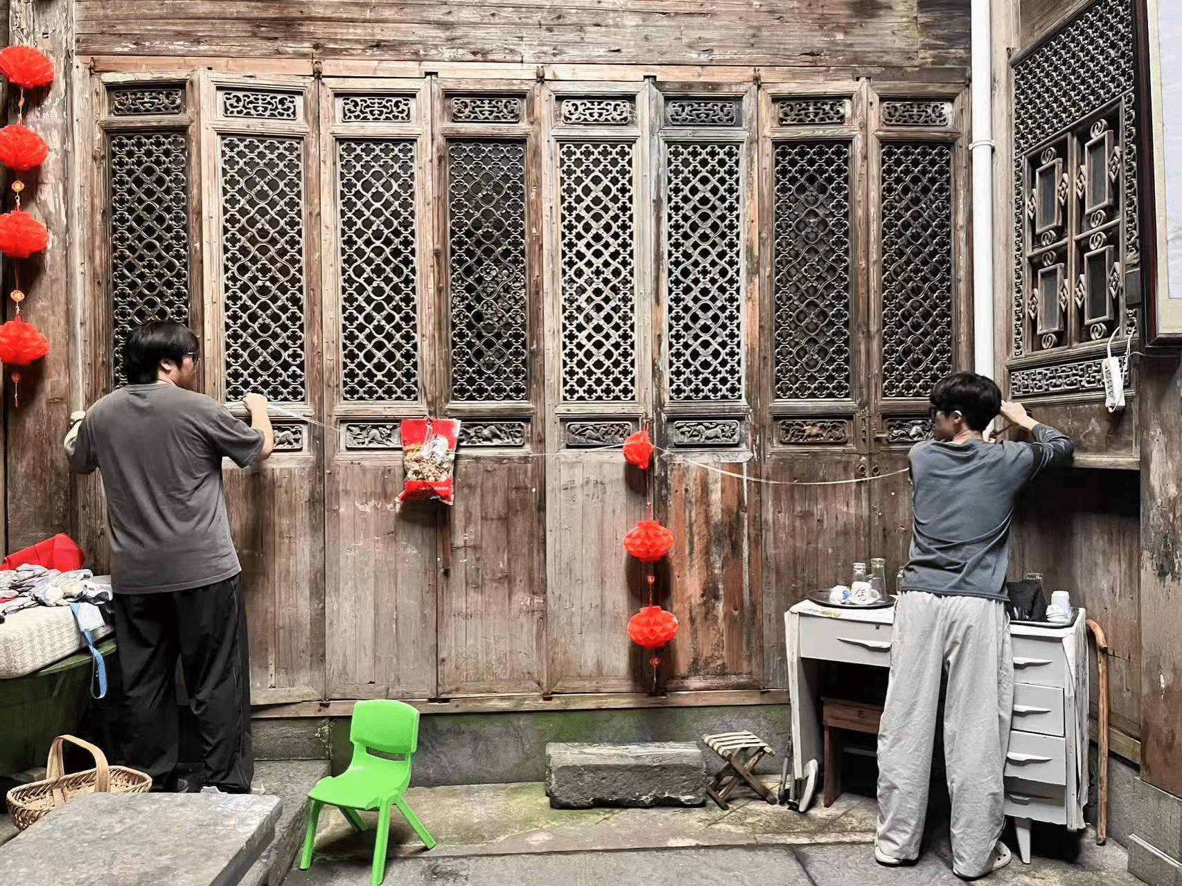 实习期间,师生团队综合运用测距仪等现代测绘技术,结合手工丈量与传统绘图,对古宅的平面布局、立面形制、结构体系、装饰艺术进行多维度记录。师生每日召开总结会,将当天采集的数据导入CAD进行空间分析并对各组草图进行纠正。经过8天高强度作业,实习团队圆满完成既定任务:绘制完成 6 栋古宅的全套测绘图纸(含平面图、立面图、剖面图、大样图等)。