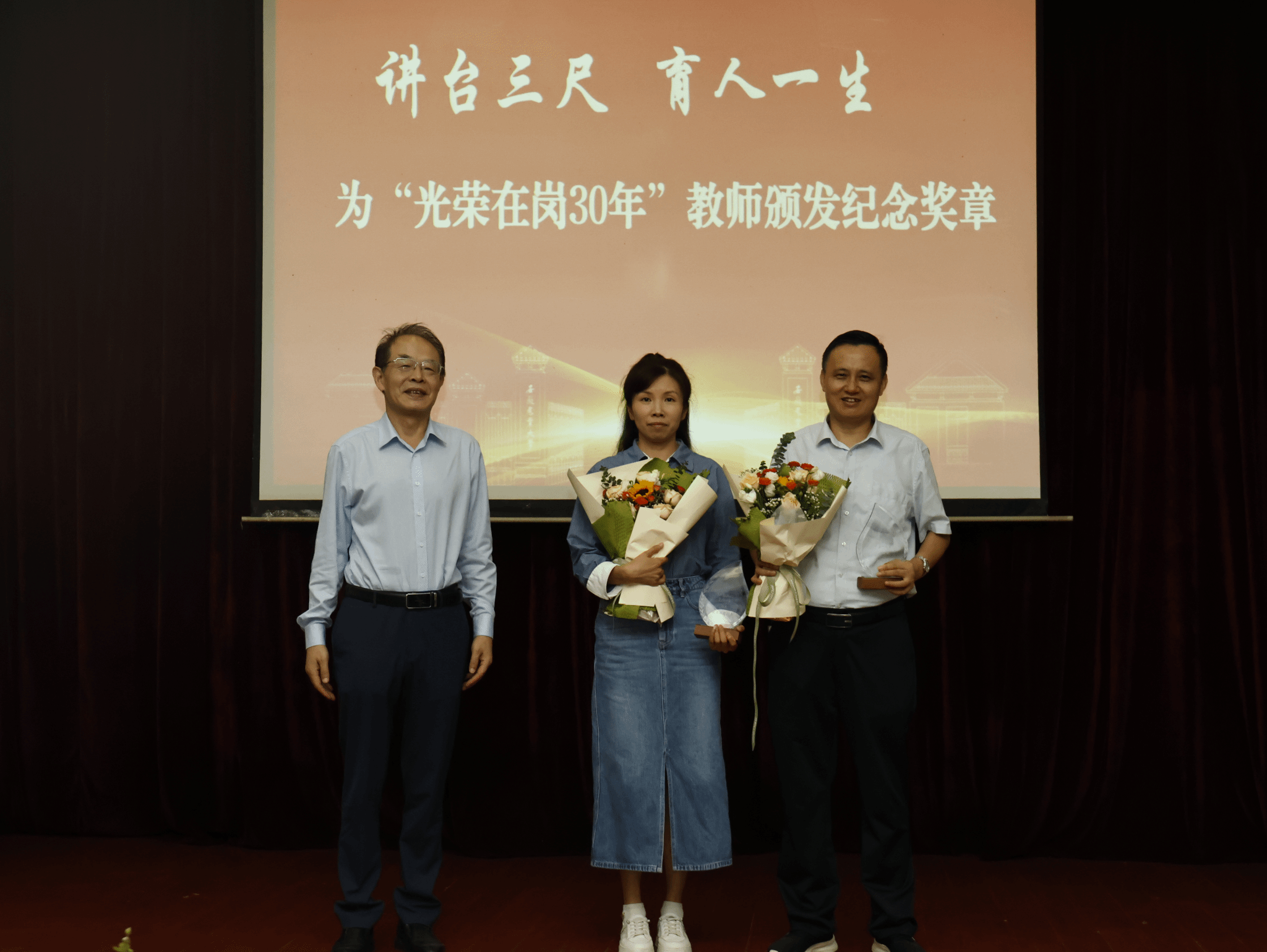 大会现场举行了多项表彰与致敬仪式:为坚守教育岗位30载的教师颁发纪念奖章并敬献鲜花;为新进教师授予教师牌;同时,对在基金申报、科研项目攻关、教学竞赛等领域斩获佳绩的教师进行了集中表彰。