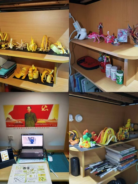 X10#422寝室将“个人爱好”与“集体生活”完美融合,电脑、海报、娃娃等元素融入日常,充满了生活气息与青春活力;X10#421寝室的书桌则拼凑出青春的模样,合照、爱好周边、画笔草稿及随手放置的小物件,共同构成了装载大笑与吐槽的最温暖“小家”;X10#417寝室将动漫、手作、音乐等不同元素,通过统一的年轻潮流感串联成一个舒适的集体空间。