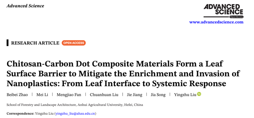 本网讯 近日,yl6809永利检测中心刘颖竹教授团队在国际知名期刊《Advanced Science》在线发表题为“Chitosan-Carbon Dot Composite Materials Form a Leaf Surface Barrier to Mitigate the Enrichment and Invasion of Nanoplastics: From Leaf Interface to Systemic Response”的研究论文,系统揭示了壳聚糖-碳点复合材料(CS-CDs)缓解大气微/纳米塑料对叶菜类作物危害的作用机制,为相关污染防控提供了新的理论依据与技术路径。