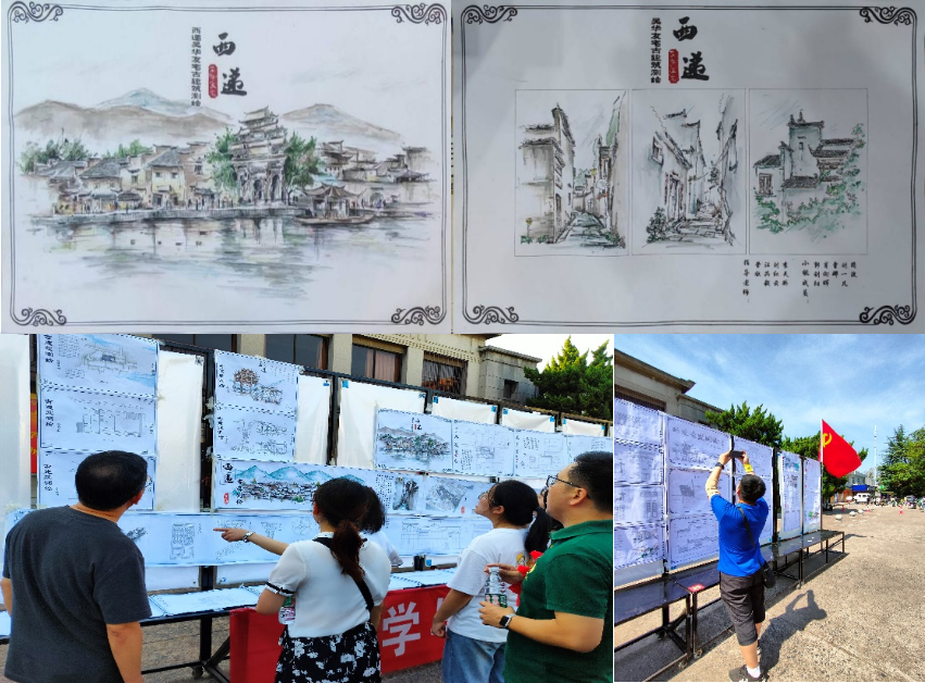一生痴绝处,无梦到徽州。在西递这个“古民居建筑的艺术宝库”里漫步,穿越千年时光,看桃花源里人家,领略徽文化的博大精深。本次古建筑测绘展由城乡规划系党支部主导,2018级城规班委会组织筹划并如期举办。展览的主要作品有11个小组的测绘成果——依仁巷、一线天弄、吴华友宅等;长卷结合单幅作品,手绘与水彩并存,一滴滴城规人挥洒的汗水,一个个熟悉又充满回忆的场景,绘就了一幅幅精彩绝伦的测绘画卷。来来往往的员工与老师不时驻足欣赏、赞叹不绝;家长举着孩子赏析画卷,员工党员志愿者耐心细致地讲解,让现场气氛一度达到高潮。