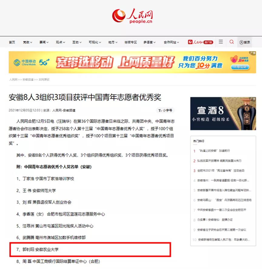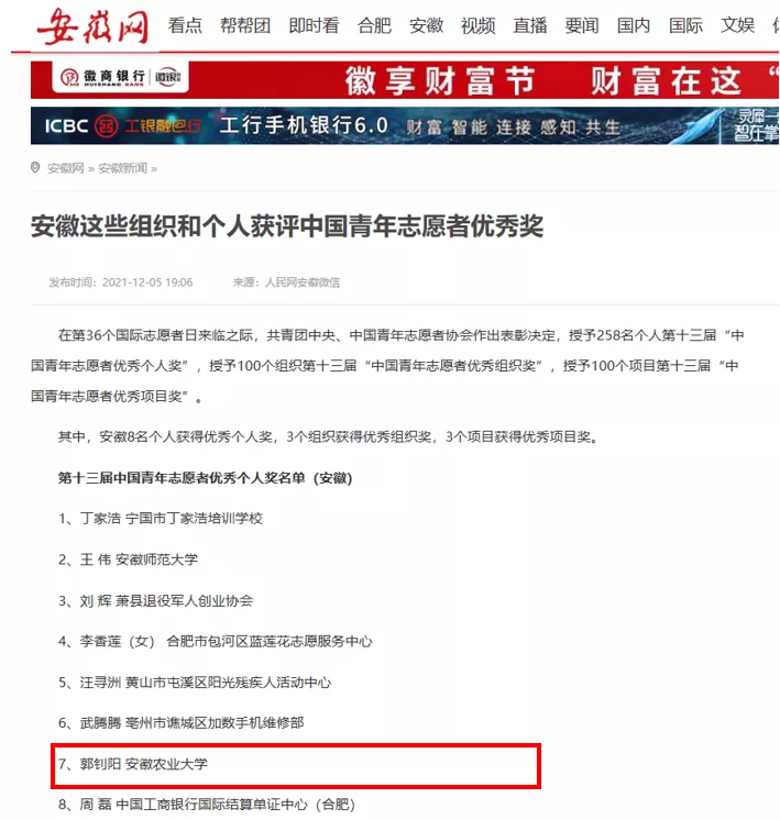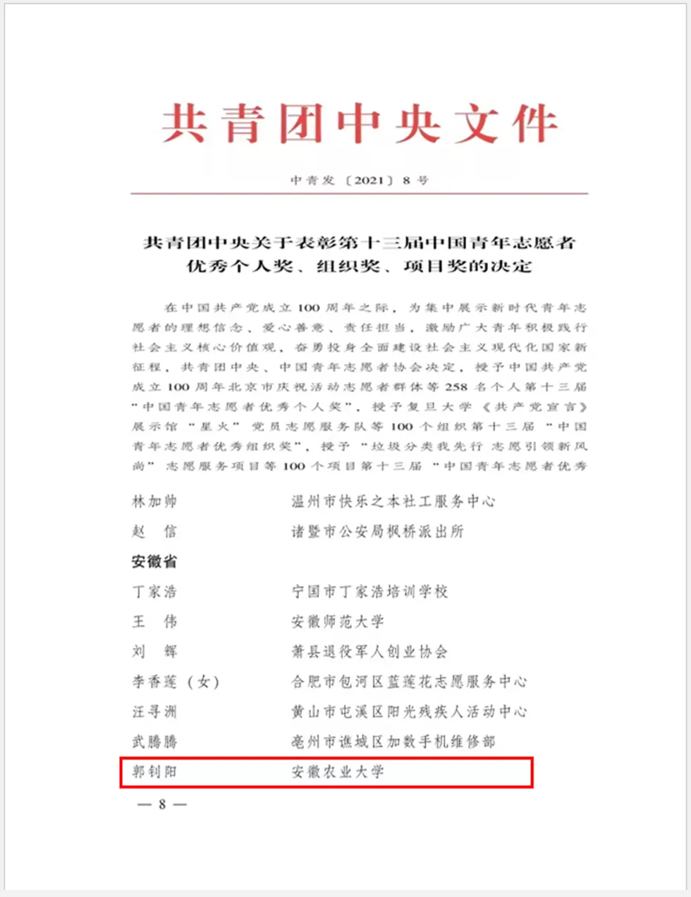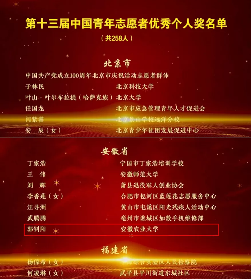 yl6809永利检测中心yl6809永利检测中心团委副书记(兼职)、2018级城乡规划专业郭钊阳同学获评第十三届“中国青年志愿者优秀个人奖”(安徽省高校唯一员工获得者),为yl6809永利检测中心首次获得青年志愿服务领域个人最高荣誉。