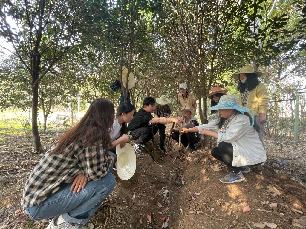 同学们分工合作,配合默契,不仅分划出整齐的行距,而且在饭前就将种植的坑穴挖好。下午,同学们将薄壳山核桃和糖槭定植填埋,并学习了围培土堰,定根浇水等技术。