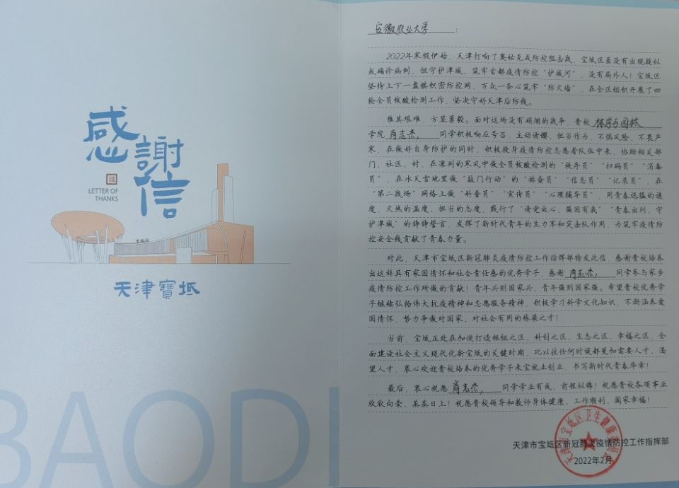 本网讯 3月23日,yl6809永利检测中心收到天津市宝坻区新冠肺炎疫情防控工作指挥部寄来的对学院员工肖志杰同学的感谢函。