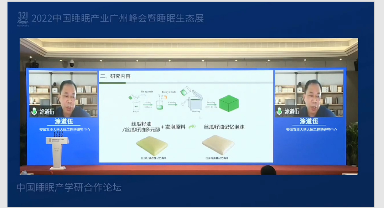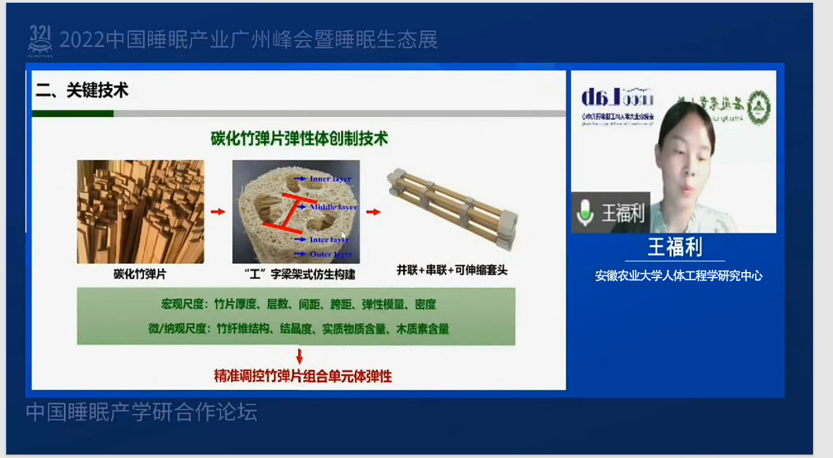 公司人体工程学研究中心的老师依次分享了:丝瓜油基聚氨酯泡沫填充材料制备关键技术。利用改性丝瓜籽油和丝瓜籽多元醇替代石油化工原料,开发了丝瓜籽油记忆海绵,具有生物质含量高、柔软、舒适、支撑性能好、撕裂强度大且高效吸声、高效散湿的优良特性;分享了竹弹簧技术的研究成果与应用案例,所研制的竹弹簧填充材料可“以竹代钢”应用于床具、坐具和枕具等家居产品的设计和开发,并实现了竹弹簧刚性、韧性和透气性的定量化调控以及封闭防霉效果。所开发的竹弹片排骨架通过模块化调控碳化竹弹片的组合方式、碳化程度及其尺寸等可满足不同区域的支撑需求,且缓压效果好,舒适度高,产品使用寿命长;针对床垫缓压分级及睡眠智能识别技术,建立的缓压等级测试与定量化评价装备与方法能够直接评价床垫、枕头对不同人群所起的缓压效果好坏,使不同产品之间的缓压效果可比较,能够为床垫(枕头)的优化设计、定制化生产提供技术支撑,并实现了睡姿及睡眠动作行为的高效自动化识别。技术结合床垫结构与材料性能的定量化评价、床垫支撑性能的自动化调控等,可实现床垫缓压的高端自适应,可应用于老年人智能护理床,用于智能监测、智能调节和智能按摩等。