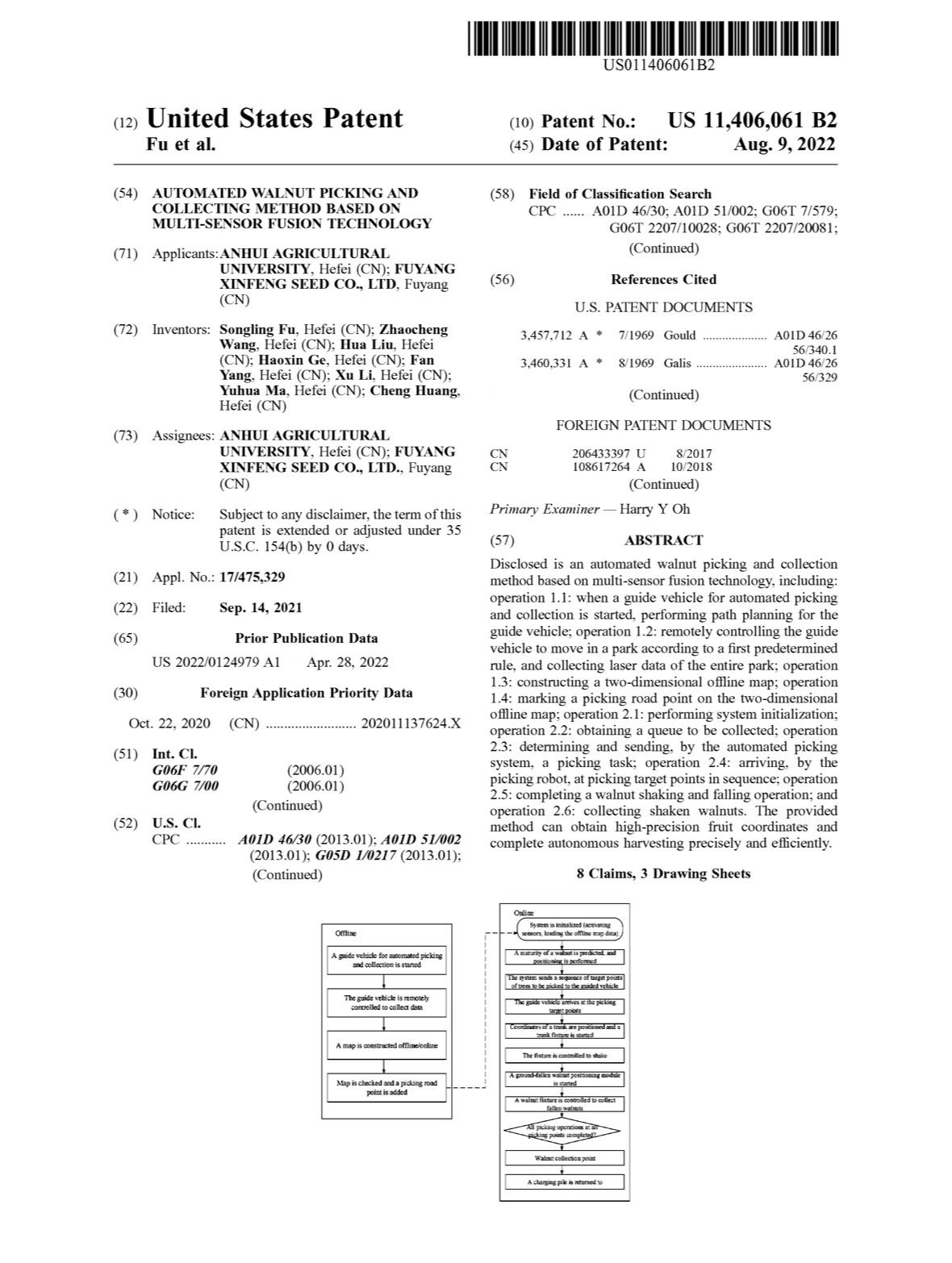 本网讯 近日,公司傅松玲教授领衔的薄壳山核桃科技创新团队联合阜阳新丰种业有限公司申请的发明专利“AUTOMATED WALNUT PICKING AND COLLECTING METHOD BASED ON MULTI-SENSOR FUSION TECHNOLOGY”(基于多传感器融合技术的薄壳山核桃自动化采收技术)获美国专利商标局(USPTO)颁发专利证书,这是我省首次获美日欧授权的薄壳山核桃发明专利。