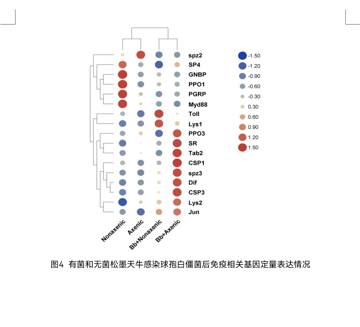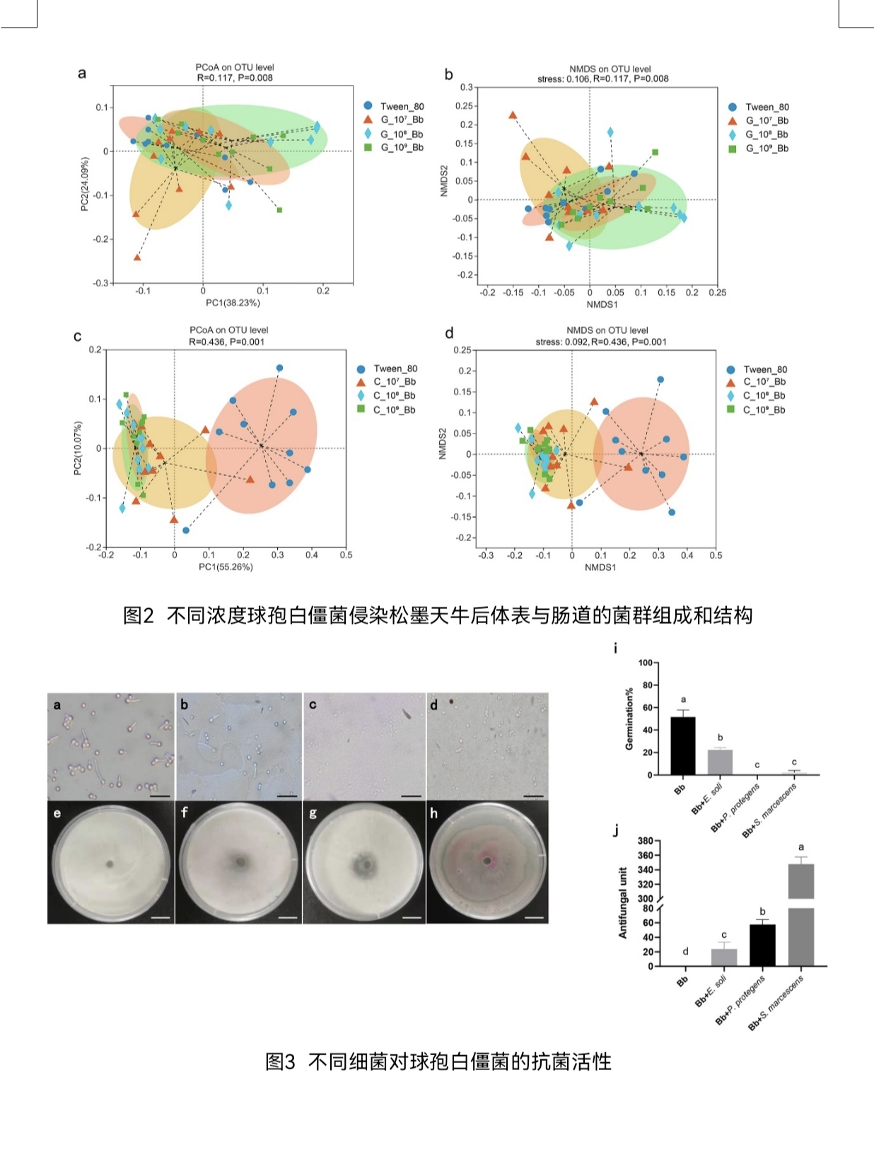 本研究以松墨天牛-共生微生物-病原真菌为研究体系,首先评估了不同浓度病原真菌球孢白僵菌对有菌和无菌松墨天牛的侵染毒力,结果显示:共生微生物的存在显著降低了松墨天牛感染球孢白僵菌的比率(图1)。而后,对松墨天牛肠道与体表微生物群落分析发现,感染球孢白僵菌后,松墨天牛体表细菌及肠道细菌群迅速响应,菌群结构发生显著变化(图2);其中,假单胞菌和沙雷氏菌成为优势菌种,且体表增长最多。进一步对峙研究证实,上述两种细菌均具能显著抑制球孢白僵菌孢子萌发与生长(图3)。此外,通过高通量测序等手段,研究人员发现:在共生微生物存在时,天牛并不需要激活免疫以抵抗病原菌的侵染(图4),从而为天牛节省更多的资源用于自身生长代谢。