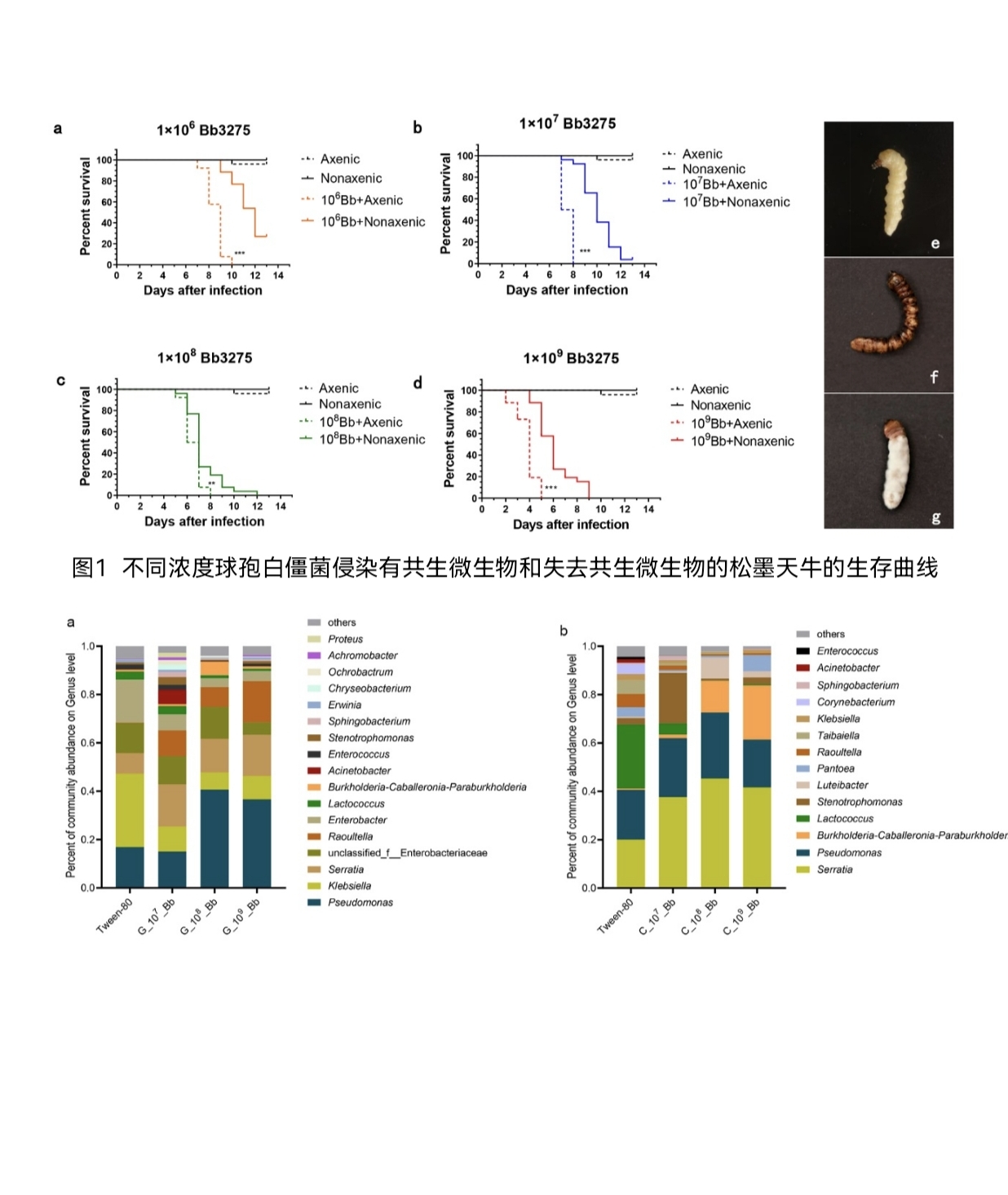 松材线虫(Bursaphelenchus xylophilus)引起的松材线虫病(Pine Wilt Disease)是全球森林生态系统中最具危险性、毁灭性的病害,具有极强的扩散性和破坏性。作为我国头号林业重大入侵有害生物,松材线虫给全国森林资源和生态环境造成了巨大破坏,造成的经济损失达数千亿元,严重制约我国林业的健康发展。松墨天牛(Monochamus alternatus Hope)是松材线虫的重要媒介昆虫。控制松墨天牛是控制松材线虫病最有效的方法之一。然而,化学农药等防治效果有限且易造成污染和抗药性,亟需开发更有效和环保的防治手段。目前,病原真菌是防治松墨天牛最具前景的生物防治手段之一。前期研究表明,共生微生物可帮助宿主昆虫抵御了病原真菌。但是松墨天牛共生微生物是否参与其与病原真菌的互作及其机制尚无报道。探究共生微生物介导的宿主与病原真菌互作,对进一步提高病原真菌防治潜力具有重要意义。