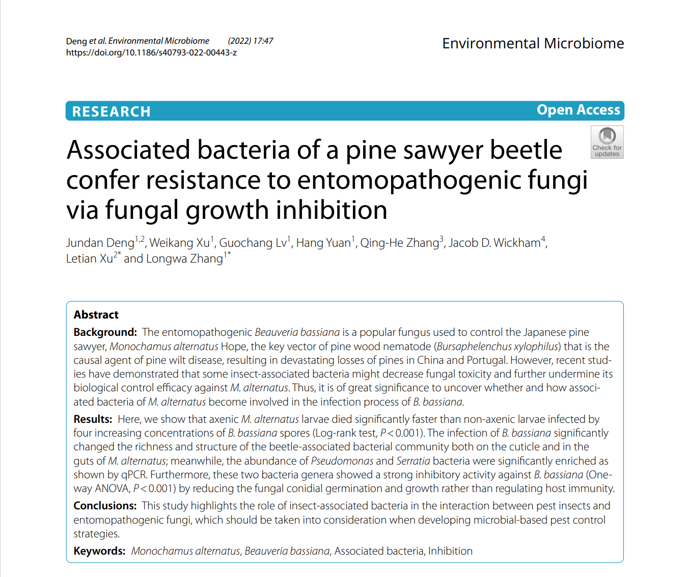 本网讯 近日,公司yl6809永利检测中心张龙娃教授团队在微生物学权威期刊《环境微生物组》(Environmental Microbiome)上发表最新研究成果《松墨天牛共生微生物通过抑制病原真菌生长帮助宿主抵御病原真菌侵染松墨天牛共生微生物通过抑制病原真菌生长帮助宿主抵御病原真菌侵染》(“Associated bacteria of a pine sawyer beetle confer resistance to entomopathogenic fungi via fungal growth inhibition”)。博士研究生邓竣丹为该论文第一作者,张龙娃教授为通讯作者;湖北大学徐乐天副教授作为共同通讯作者参与本项工作。