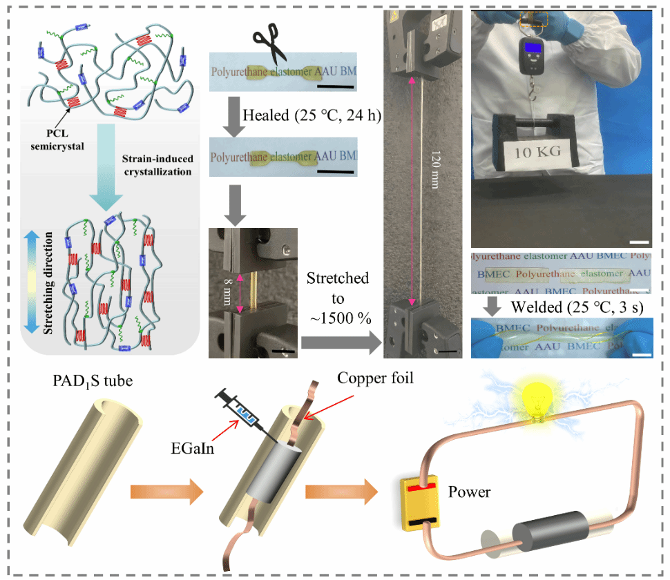 研究以农林非食用橡胶籽油为原料,实现高纯度生物基二元醇的高效合成,进而构筑了一种在室温下能够快速自主愈合的聚氨酯弹性体。该弹性体具有强韧的机械性能(拉伸强度:21.8 MPa,断裂伸长率:1600%)。这种材料在人为破坏切断后,3秒内能够自主愈合,24小时后完全愈合,即机械性能恢复至本体初始强度。该研究拓宽了植物油脂的应用领域,为调和材料高力学强度和高愈合效率之间的固有矛盾提供了一种新的解决思路,并促进了木本油脂的高附加值利用。