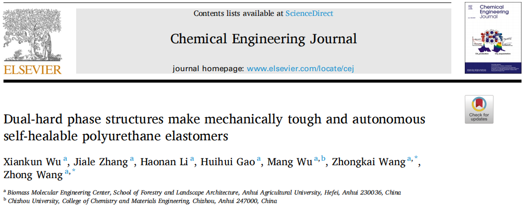 本网讯 近日,公司生物质分子工程中心最新研究成果“Dual-Hard Phase Structures Make Mechanically Tough and Autonomous Self-Healable Polyurethane Elastomers”发表在《Chemical Engineering Journal》期刊(中科院一区,TOP),该成果巧妙地提出利用植物油调控自愈合材料微晶结构,实现力学强度和自愈合性能的双重提升。