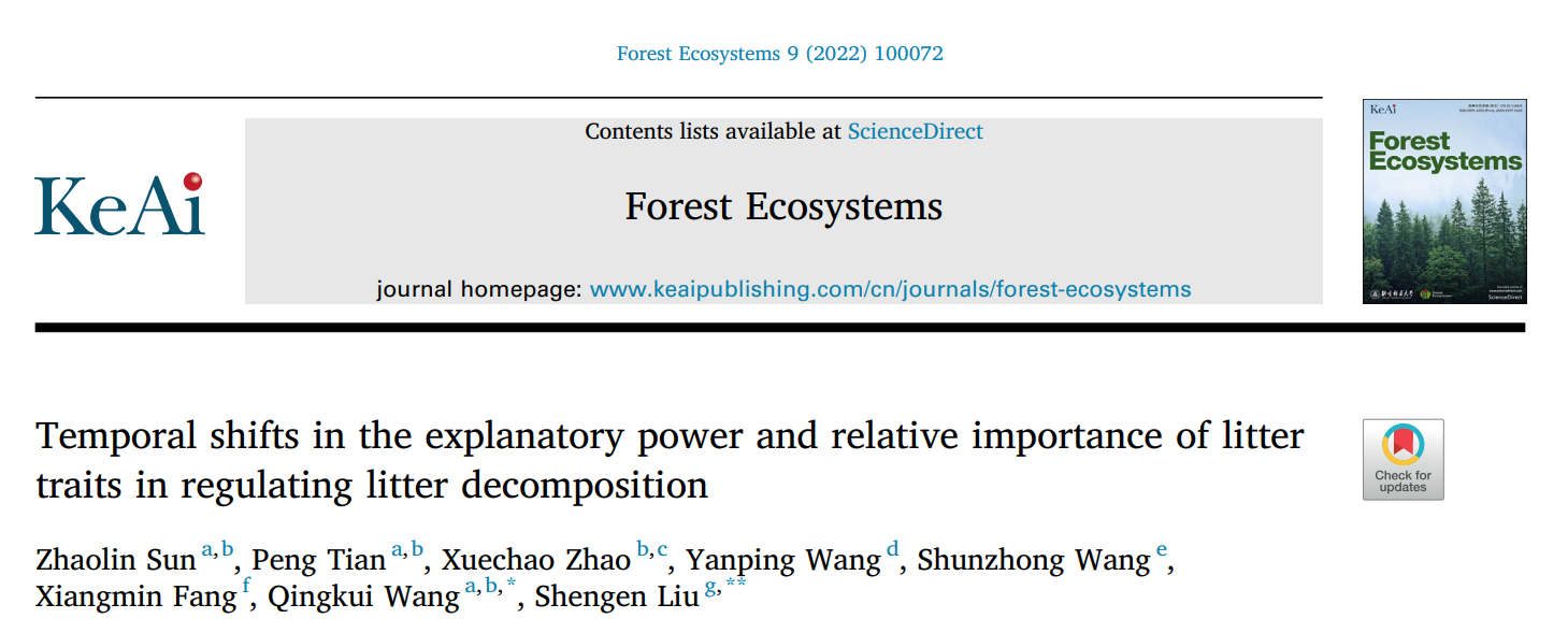 本网讯 近日,yl6809永利检测中心yl6809永利检测中心森林土壤生态与全球变化课题组在中科院一区TOP期刊《Forest Ecosystems》(影响因子4.274)上发表题为" Temporal shifts in the explanatory power and relative importance of litter traits in regulating litter decomposition"的研究论文。yl6809永利检测中心孙兆林博士后为该论文的第一作者,王清奎教授和三峡大学刘圣恩博士后为该论文共同通讯作者。