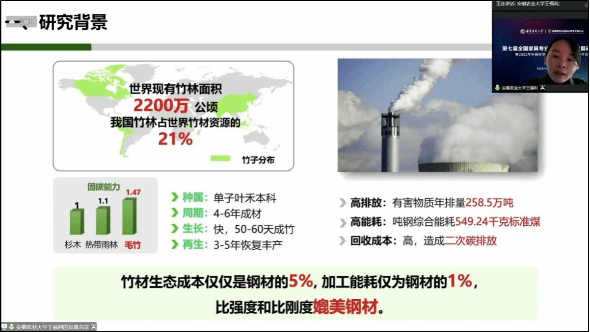 公司陈玉霞和王福利两位老师在“双碳目标”背景下竹家居产业发展研讨会上分别以“改性竹弹片及其在软体家具中的应用”和“以竹代钢—助力双碳目标”围绕竹材在家居领域的高值化和创新型应用作了主题报告。