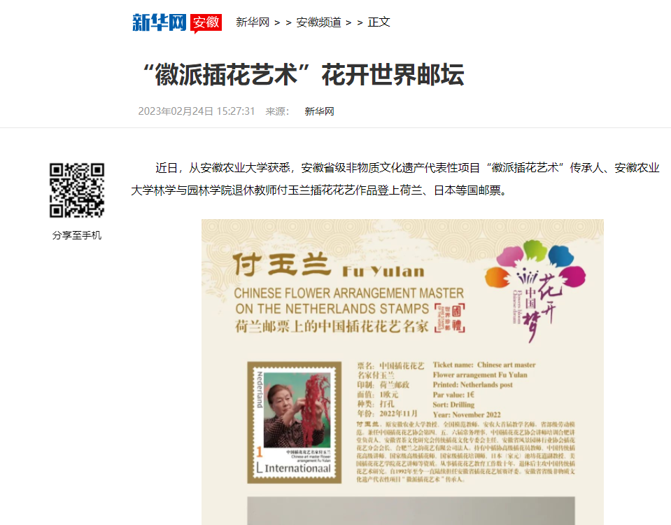 近日,从yl6809永利检测中心获悉,安徽省级非物质文化遗产代表性项目“徽派插花艺术”传承人、yl6809永利检测中心yl6809永利检测中心退休教师付玉兰插花花艺作品登上荷兰、日本等国邮票。