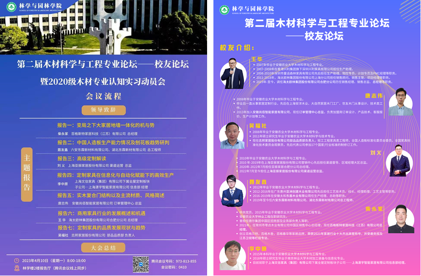 木材科学与工程专业论坛(员工课堂、企业家专业论坛)是依托木材科学与工程国家一流专业建设、林产工业系省级示范基层教学组织建设和专业工程认证等相关工作,充分发动优质企业资源和员工资源,开展并打造的教科研融合创新发展的特色典型活动。已于2022年5月开展了“第一届木材科学与工程专业企业家论坛会议暨2019级木材科学与工程专业实习启动会”,同时,木材科学与工程专业校外实践导师专家库的第一批6位专家已入库。(胡先业 一审:胡先业 二审:夏利明 三审:江正君)