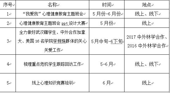 5•25心理健康活动月期间,各学院要围绕活动主题,结合学院特色,创新方法,面向毕业生开展特色心理活动及个性化服务项目,研究建立心理健康咨询与思想教育、职业指导、就业帮扶等有机结合的工作机制,探索通过QQ群、网络课堂、线上团体等“云”形式开展班会、沙龙等主题教育活动,重点从珍爱生命、情绪宣泄、压力调节、睡眠调控、疫情心理健康指导、职前心理适应等方面,引导员工调整心态,提升心理应对能力。