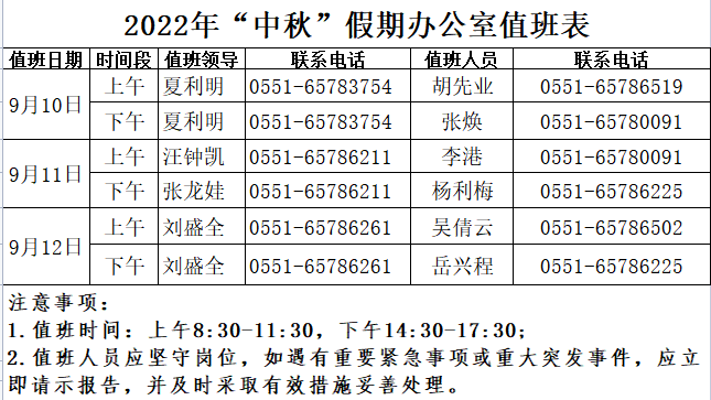 yl6809永利检测中心2022年“中秋”假期办公室值班表