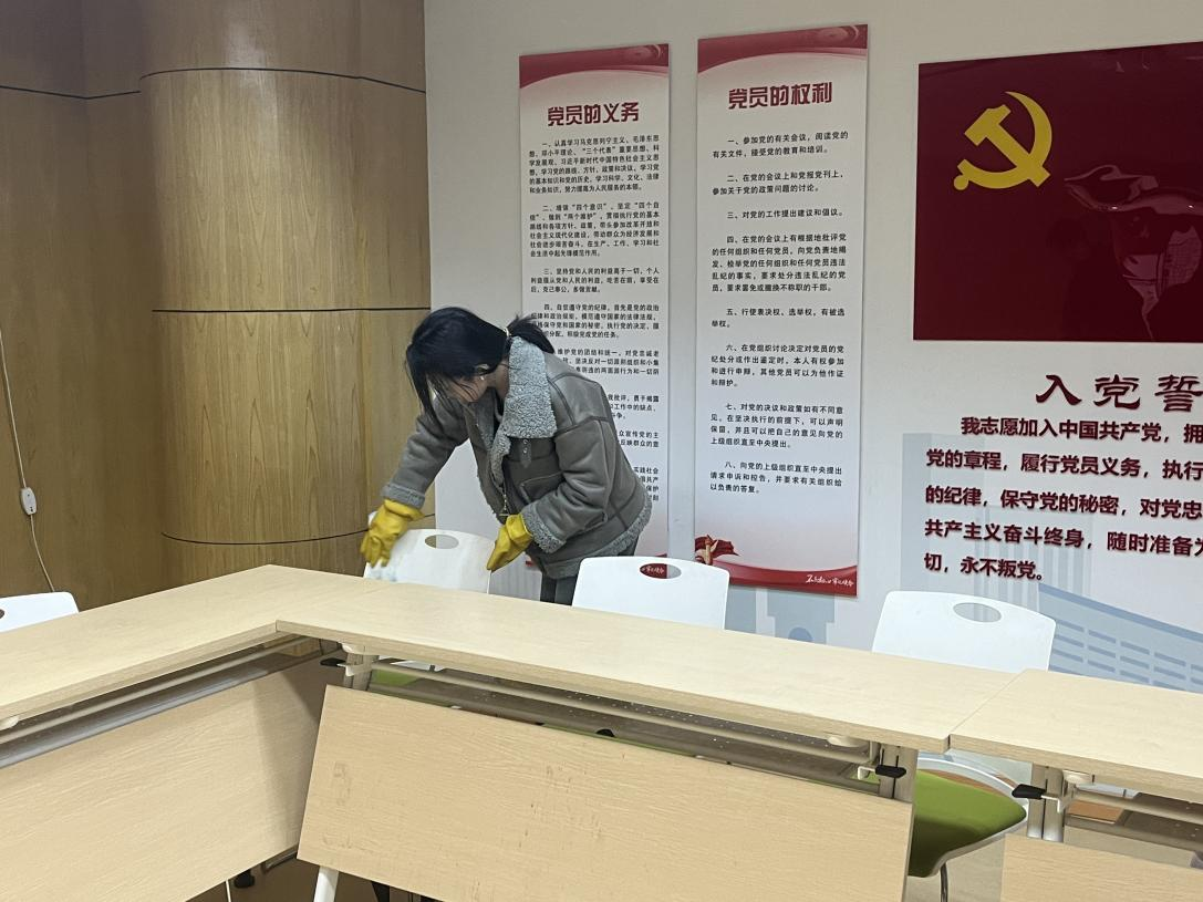 活动中,大家本着“奉献、友爱、互助、进步”的志愿精神,分工明确,协同合作,手持扫把、抹布、拖把等清洁工具,积极清理社区中心积攒的灰尘垃圾,同时将桌椅等摆放整齐。细心的志愿者们不仅将桌椅的灰尘擦拭的干干净净,连门窗以及一些卫生死角也能兼顾到,身体力行用自己的微薄力量美化社区环境。经过接近两个小时的努力,社区服务中心整体卫生得到了改善,营造了文明和谐的社区氛围,进一步提升了社区居民的满足感和幸福感。