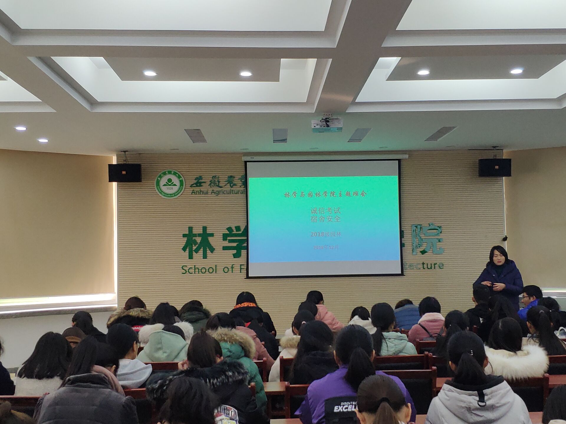 12月14日,2018级园林专业在林学楼二楼报告厅召开“诚信考试宿舍安全”主题班会,班会由辅导员徐玉品老师主持。
