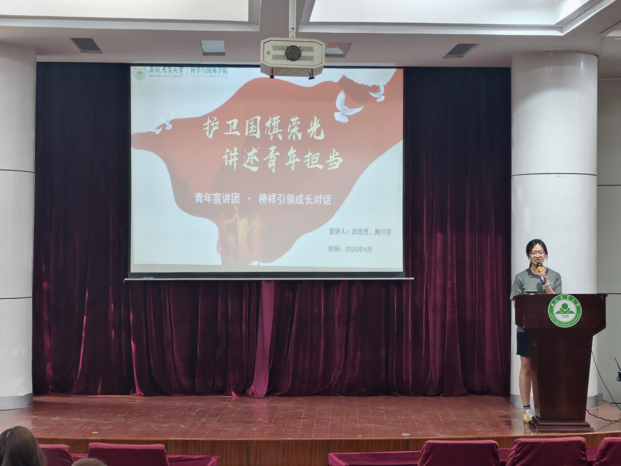 本网讯 为深入贯彻爱国主义教育,增强青年学子的国防意识与家国情怀,4月10日下午,25级林学、园林专业在林学楼一楼报告厅举办“心系国防——青春与钢枪的对话”主题班会。活动邀请校国旗护卫队优秀成员田浩男、陶兴睿同学担任主讲嘉宾,分享他们以青春守护国旗的亲身经历与感悟。活动由辅导员任丽丽老师主持。